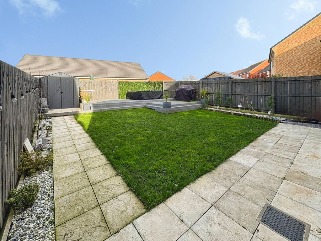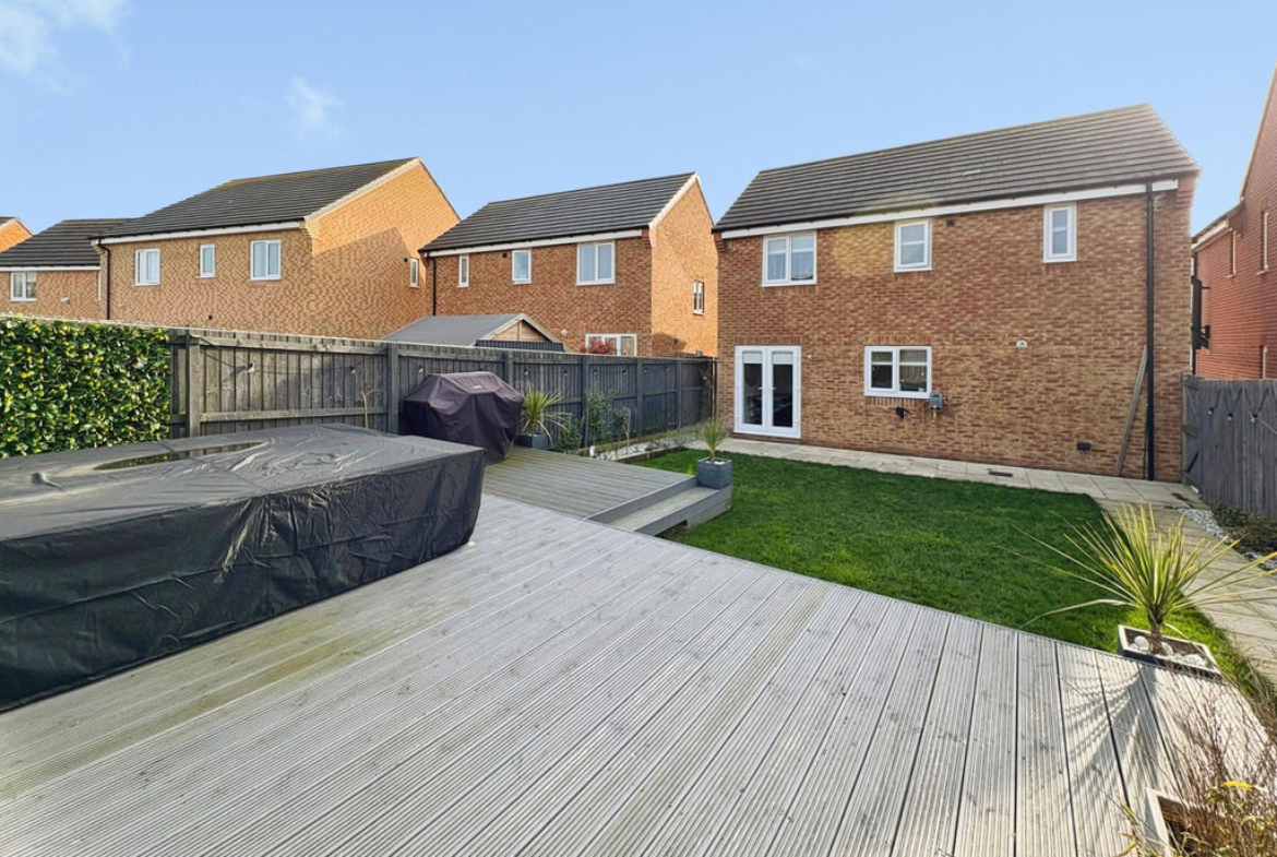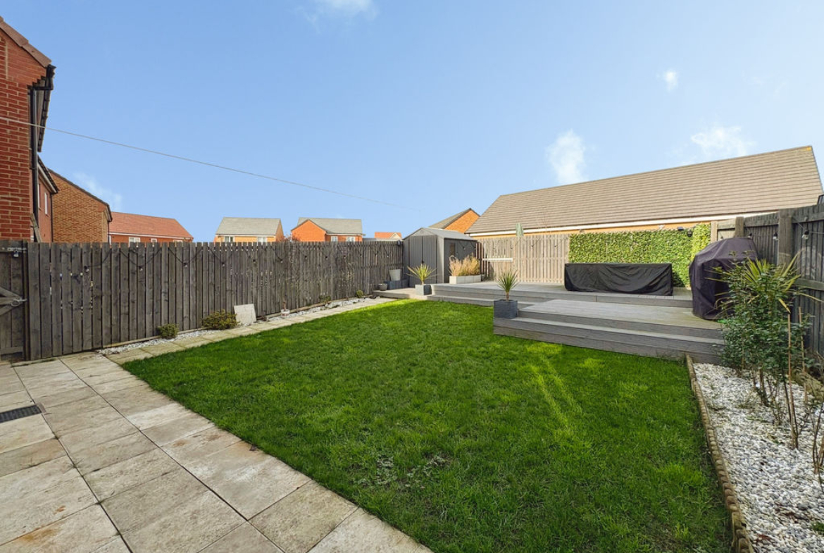 Both bathrooms are finished to a high standard with sleek fittings, modern tiling, and walk-in shower facilities, creating a fresh and relaxing atmosphere. Outside, the rear garden provides an excellent space for outdoor living, featuring a well-maintained lawn and a decked patio area, all enclosed by secure fencing to ensure privacy and safety for children or pets.