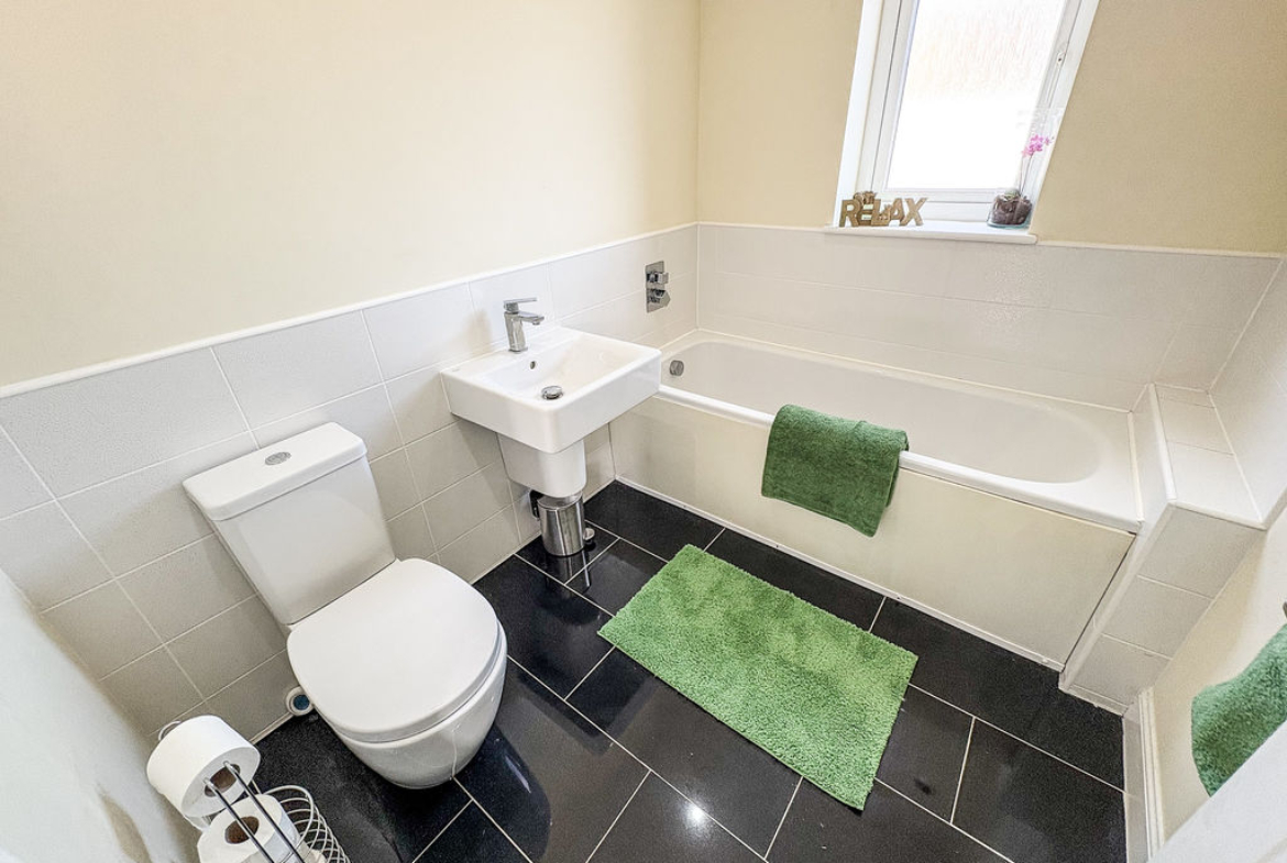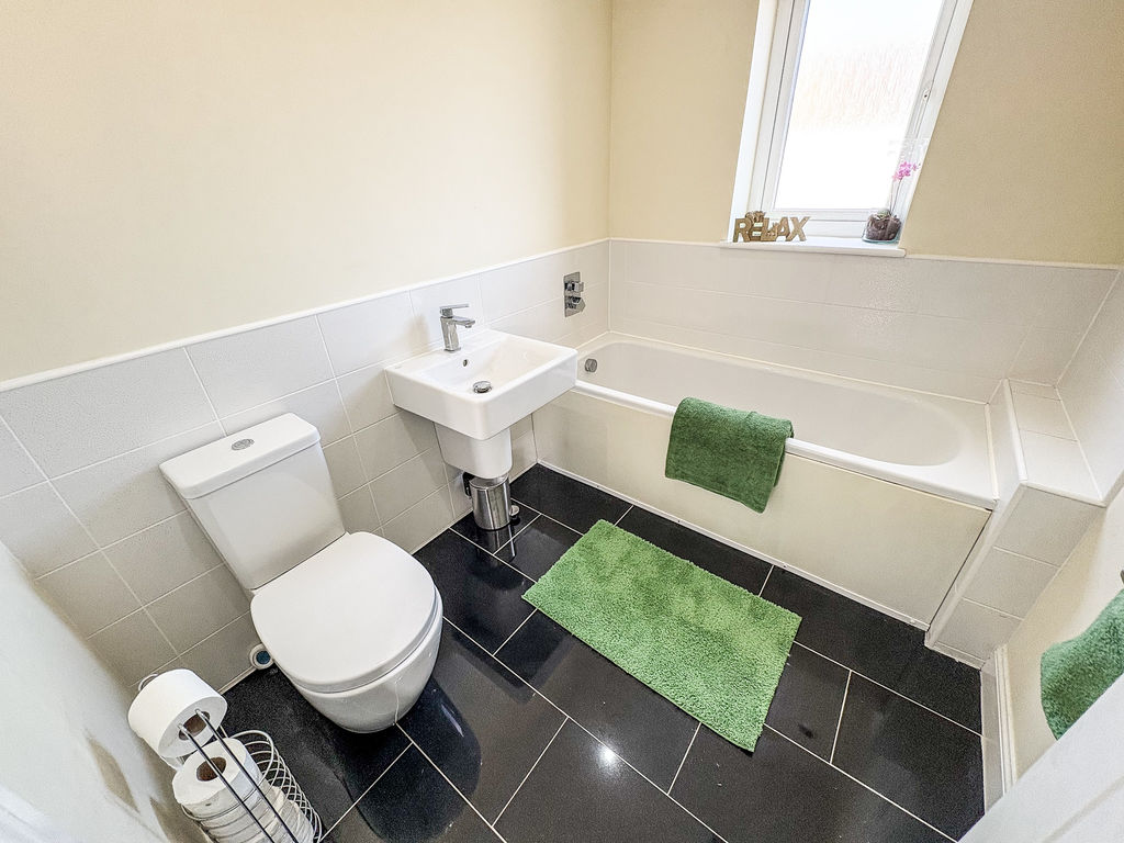 Excellent size, stylish family bathroom comprising, bath with recessed chrome controls, pedestal washbasin with mixer taps, low level W.C. with push button cistern, tiled splash backs, high gloss tiled floor with under-floor heating, double glazed window, spotlights to ceiling, radiator