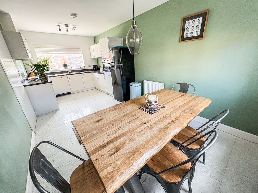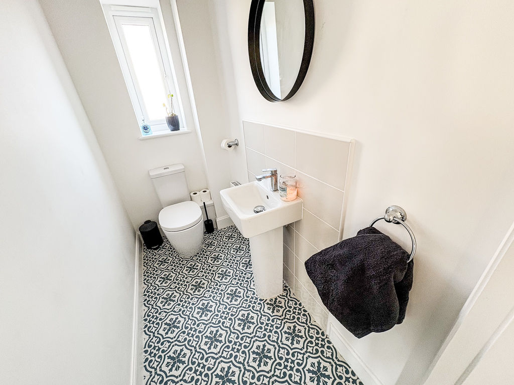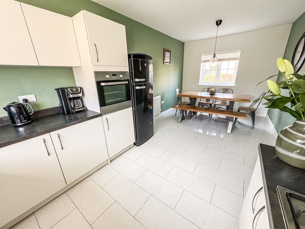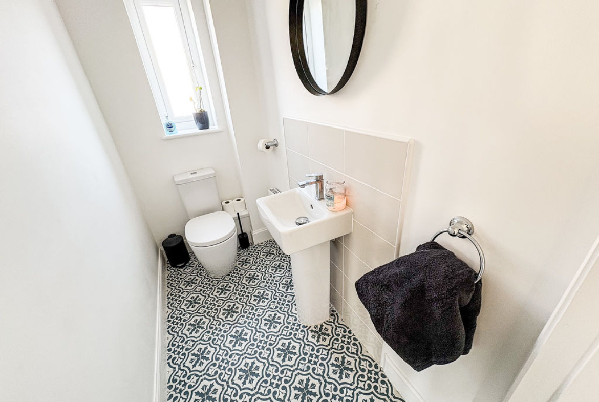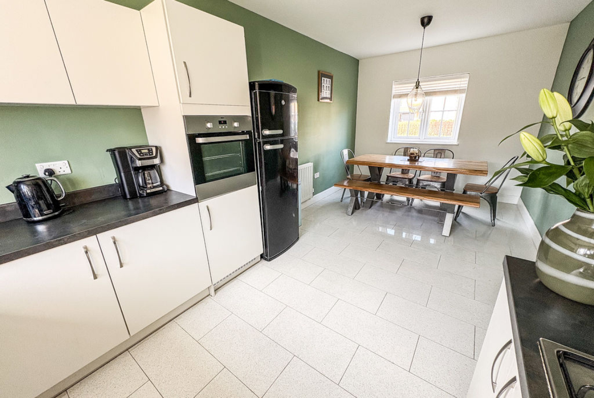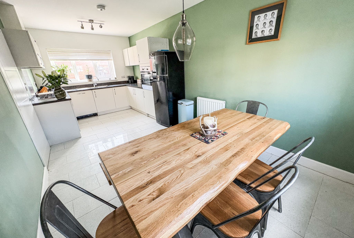 At the heart of the home lies a stunning dining kitchen, beautifully appointed with integrated appliances and generous space for both everyday living and entertaining. A separate utility room and a convenient downstairs cloakroom/WC further enhance the practicality of the ground floor.