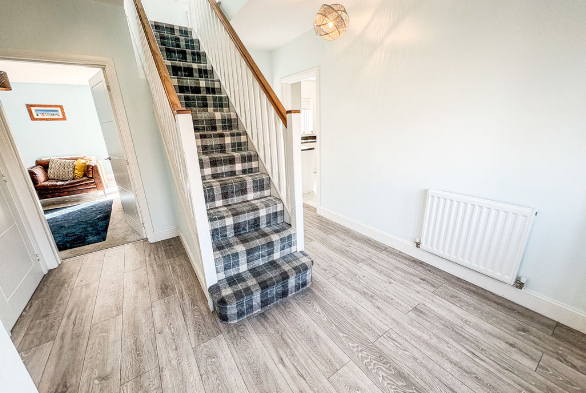 From the moment you step inside, the sense of space and quality is unmistakable. A striking hallway with a central staircase creates a grand first impression, setting the tone for the thoughtfully designed interior. To the rear, the elegant lounge is bathed in natural light, with French doors opening onto the garden, creating a seamless flow between indoor and outdoor living. A separate study or playroom adds valuable flexibility, ideal for home working or family life.