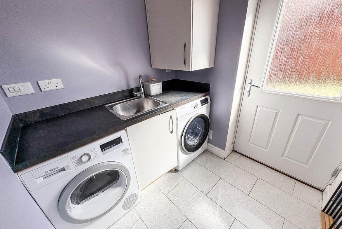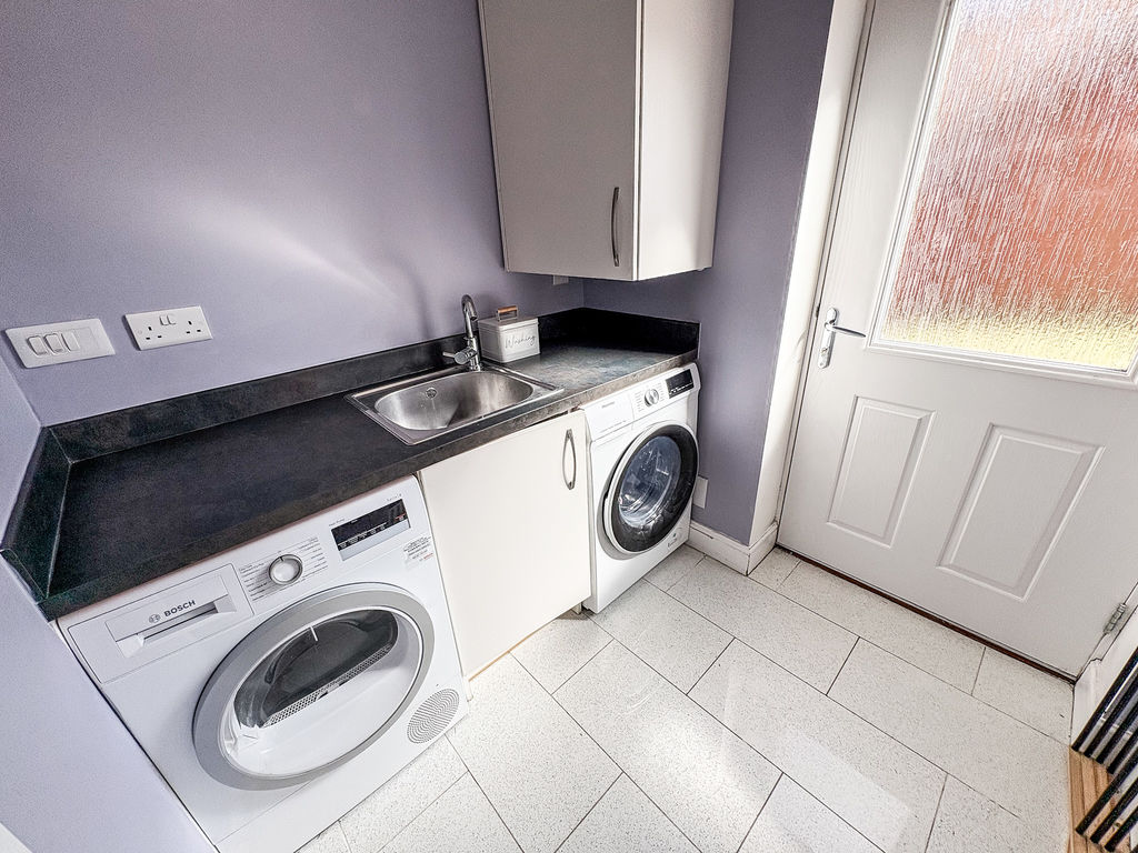 Contemporary base unit with coordinating worktops, single drainer sink unit with mixer taps, plumbed for automatic washing machine, tiled floor, radiator, central heating boiler, extractor, double glazed door to the rear garden