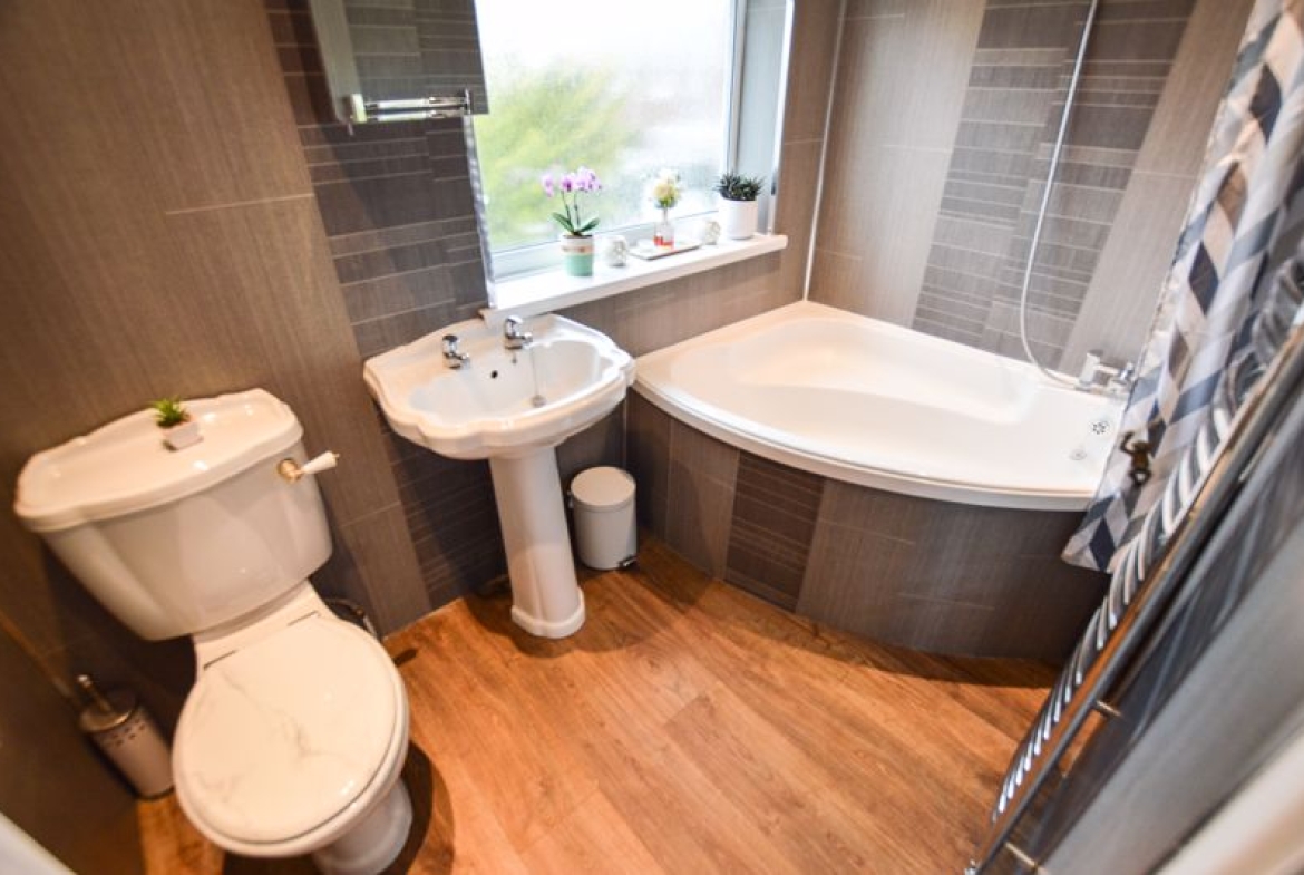 Double glazed frosted window to rear, panelled bath with shower over, pedestal wash hand basin, low level w.c, heated towel rail.