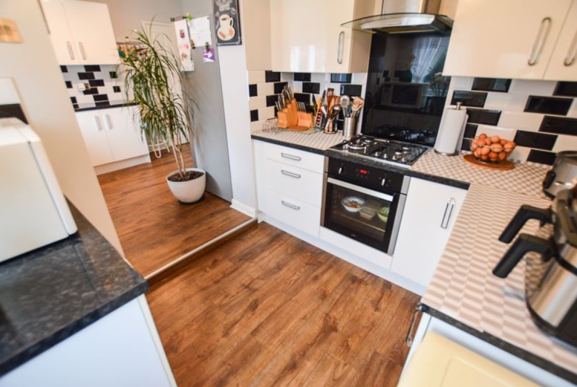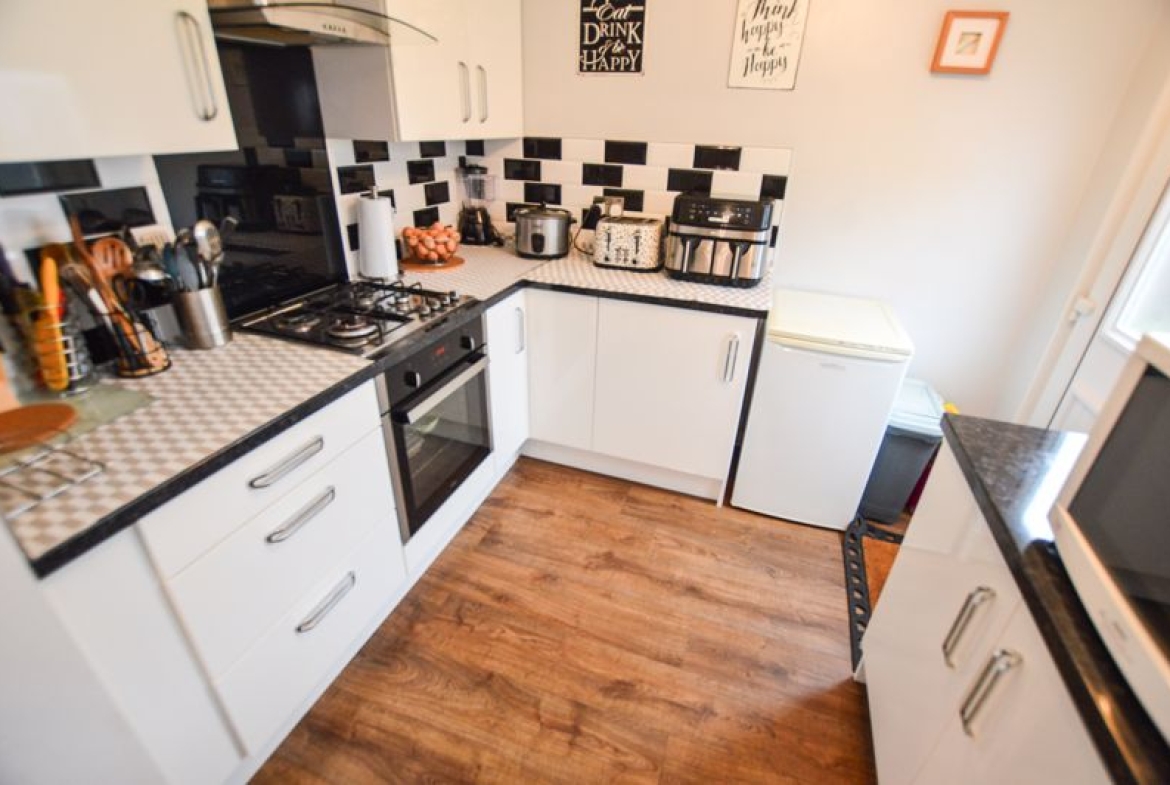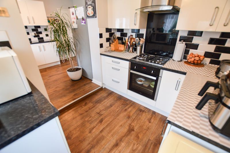 Double glazed window to rear, range of wall, floor and drawers units with roll top work surfaces, stainless steel sink and drainer unit with mixer tap, tiled splash backs electric oven, gas hob with extract fan above.
