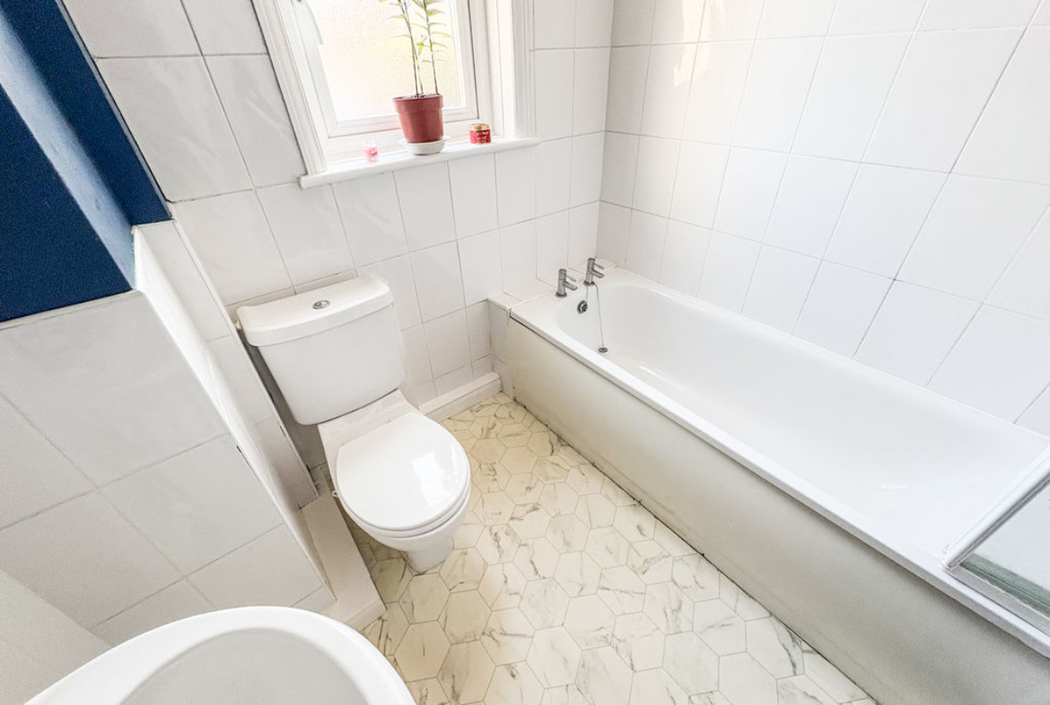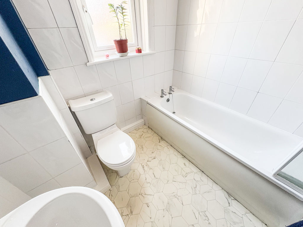 Modern suite comprising of bath, chrome shower with large contemporary daisy head, pedestal wash hand basin, low level WC, double radiator, extractor fan, half tiled walls, double glazed window