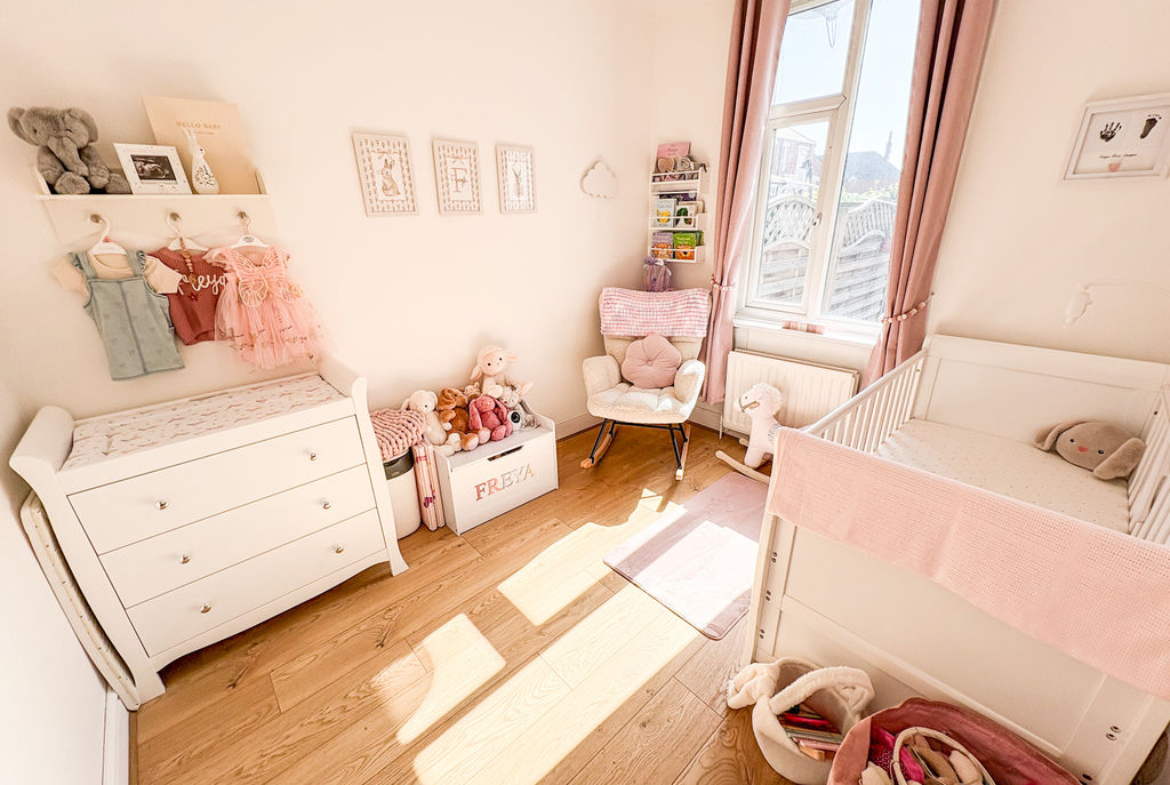 The flat features two well-proportioned bedrooms, including a charming principal bedroom with an elegant bay window. A newly fitted contemporary kitchen, complete with integrated appliances, has been thoughtfully designed to complement the home’s stylish interior. There is also a useful storage cupboard, adding to the practicality of the space.