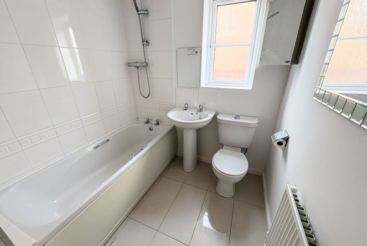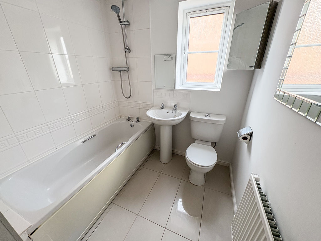 FAMILY BATHROOM: 3 piece suite compromising panelled bath, shower over, wash hand basin, low level wc, and double glazed window to side, single radiator, part tiling to walls and tiled flooring.
