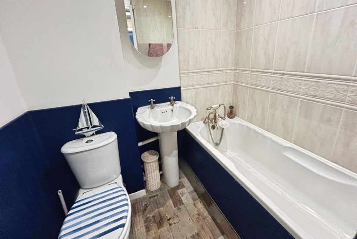 Briefly comprising; Low level W.C., panelled bath, pedestal wash hand basin, radiator, extractor fan.