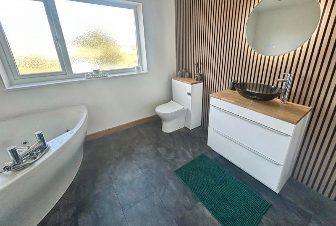 Stunning four piece suite comprising; low level W.C., corner style Jaccuzzi bath tub with mixer tap and shower head, step in shower cubicle, wash hand bowl basin in vanity unit with mixer tap, heated towel rail, UPVC double glazed frosted window to front.