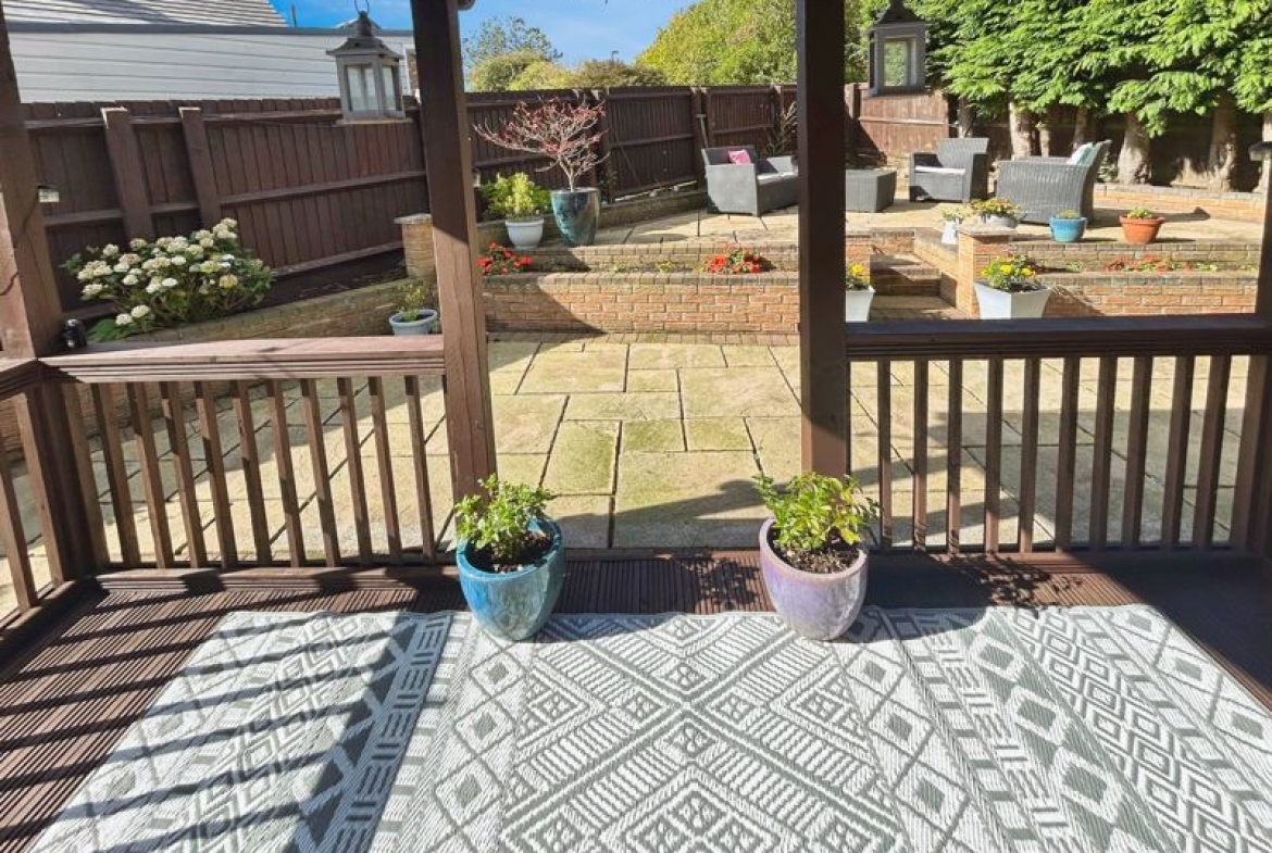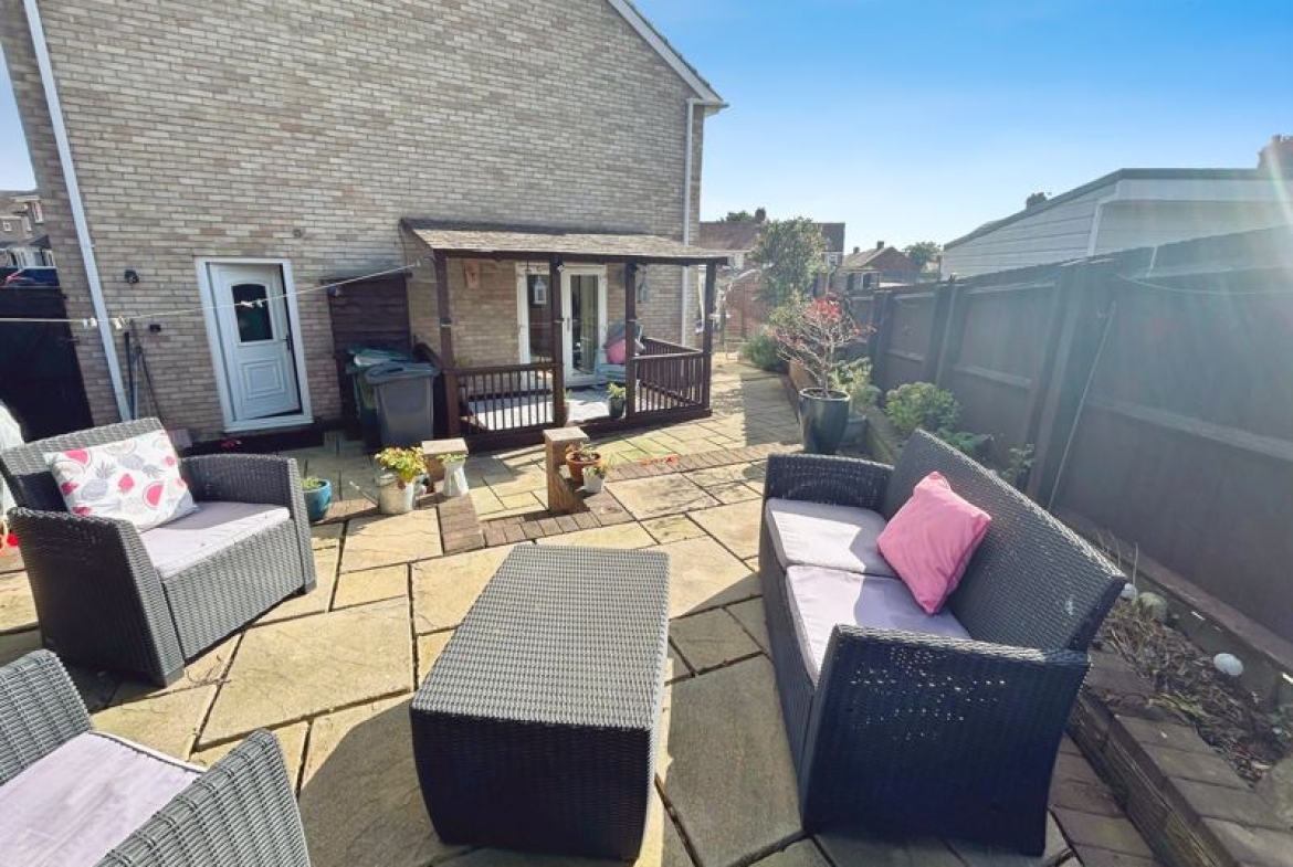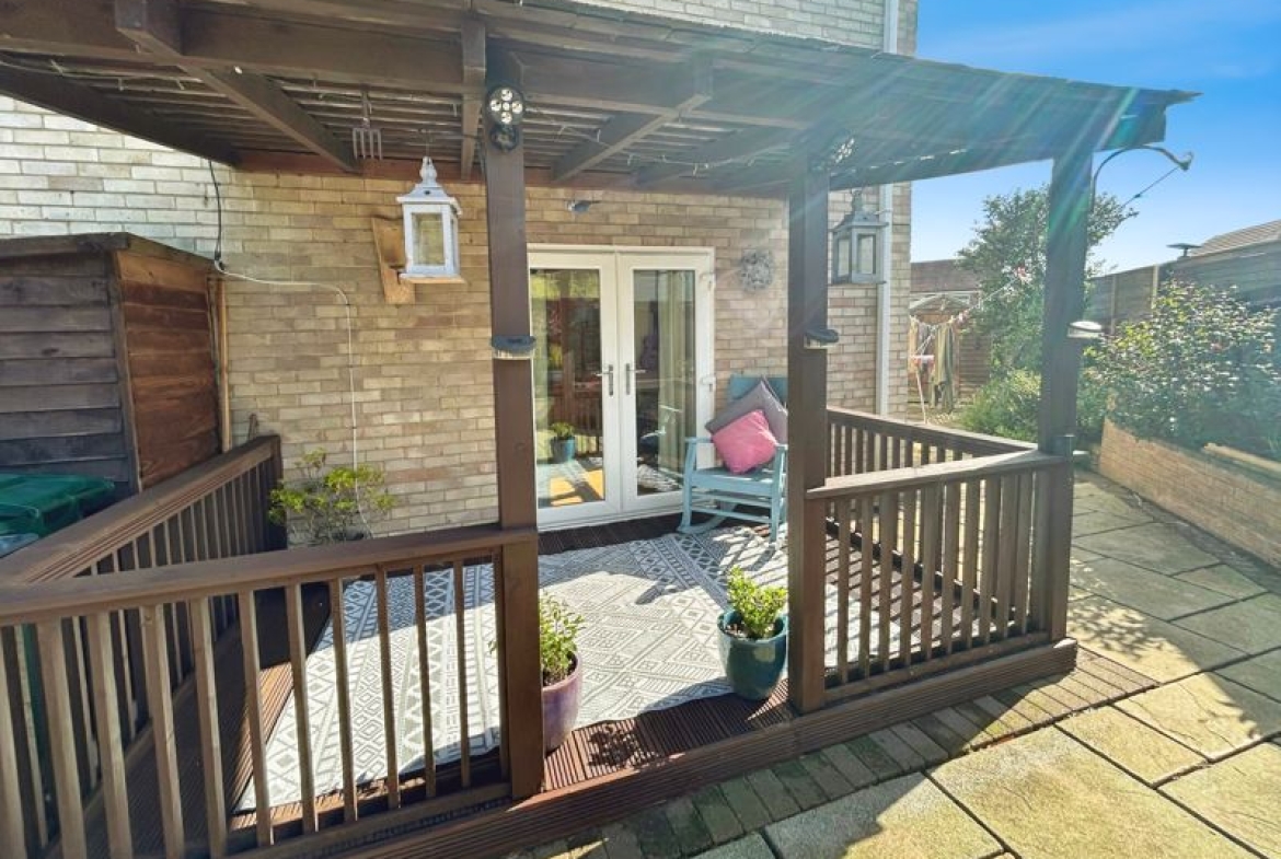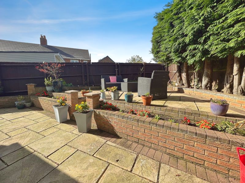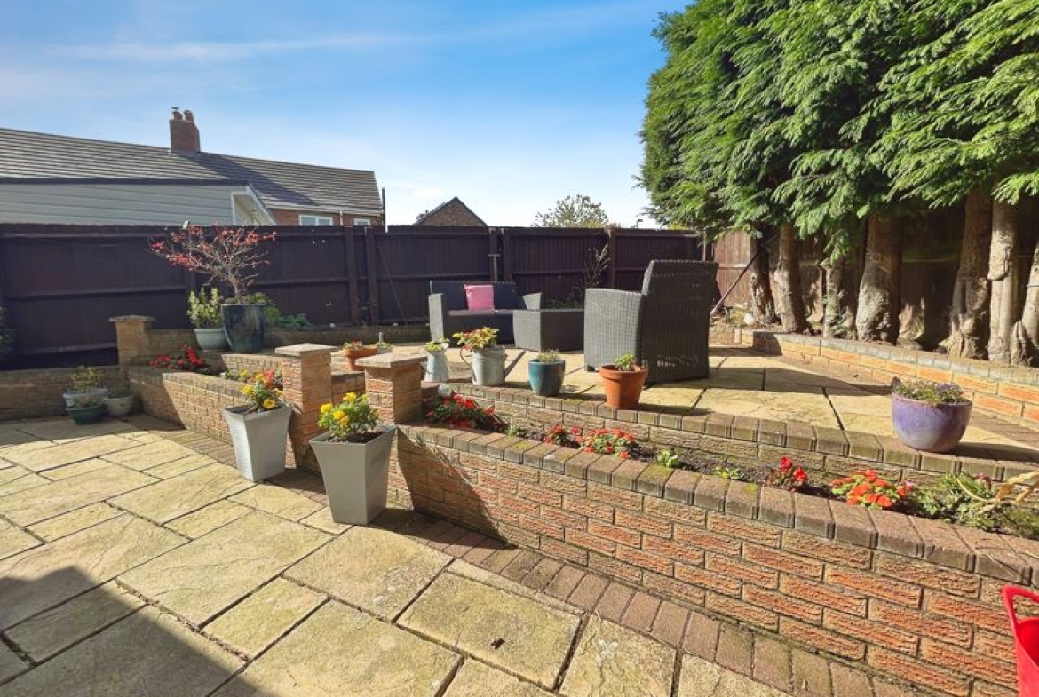 Rear- Decked seating area with shelter, patio and raised patio area with pond, brick raised planted borders, mature trees, fenced boundaries, gated access to front.