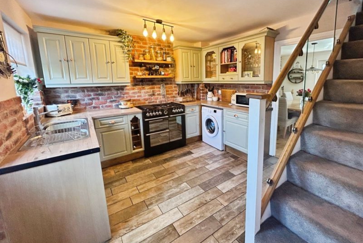 Fitted wall and base units with work surfaces incorporating a one and a half bowl sink unit with mixer tap, free standing range cooker, space for washing machine, wine rack, under stair storage cupboard, radiator, two UPVC double glazed windows to front, UPVC double glazed entrance door, staircase to first floor, door to