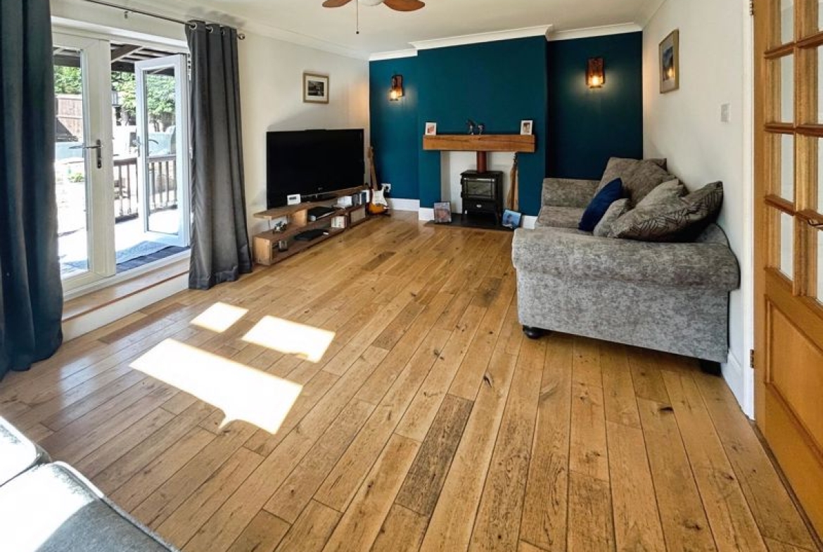 Feature fireplace with log burn effect stove, wall lights, radiator, UPVC double glazed window to rear, UPVC double glazed French doors to garden.