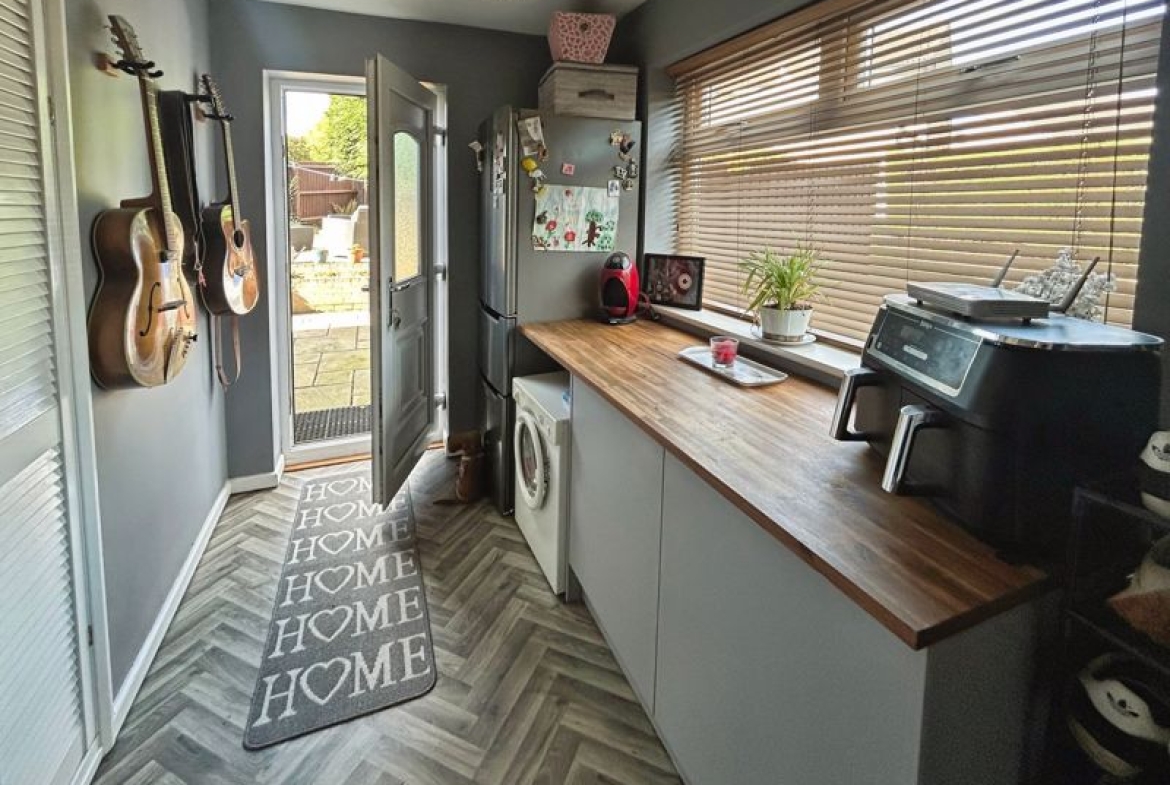 Fitted base units with work surface, space for fridge freezer, space for tumble dryer, combination boiler, storage cupboard, UPVC double glazed window to front, UPVC double glazed door to side.