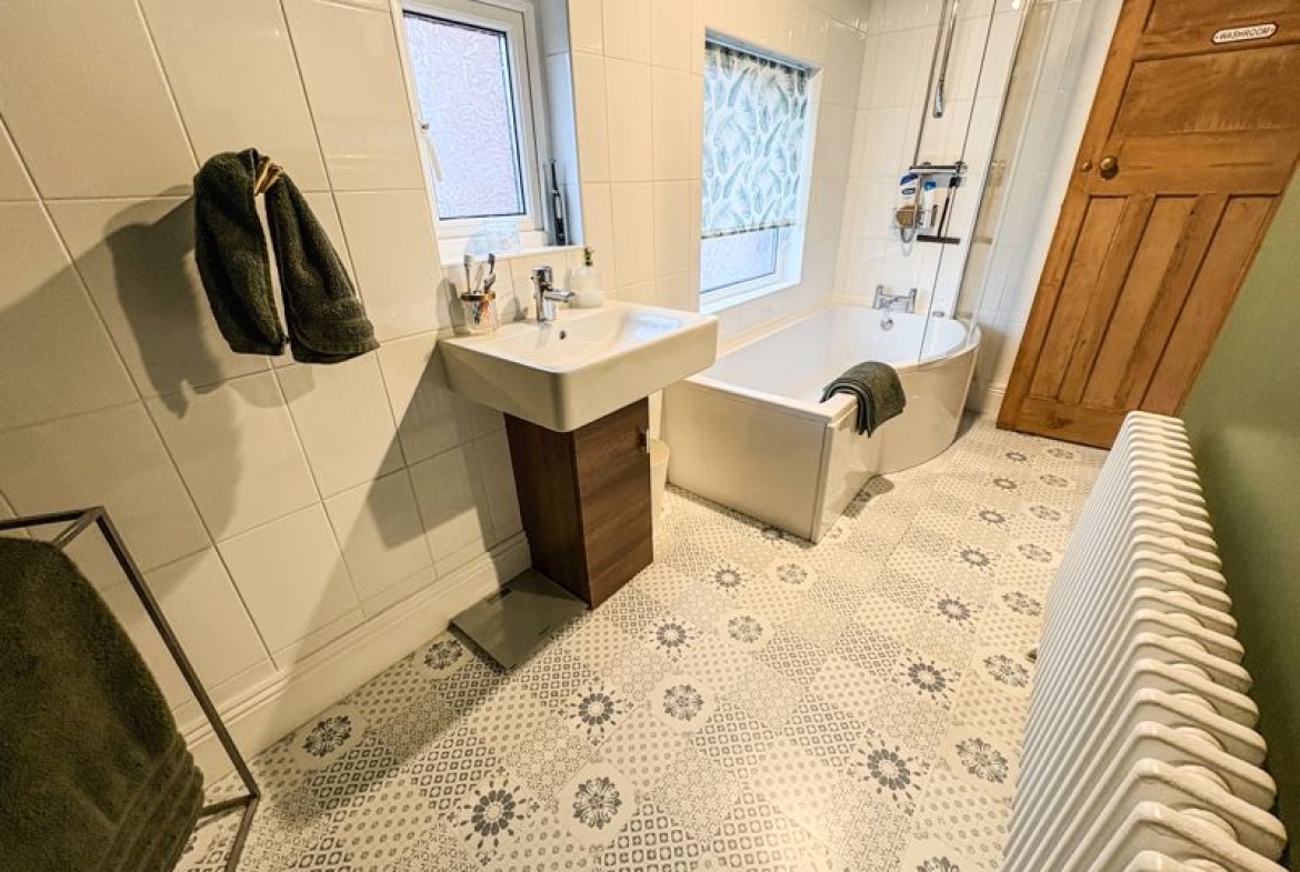 Shower over panelled bath with hand wash basin, double glazing to side. Separate WC with window