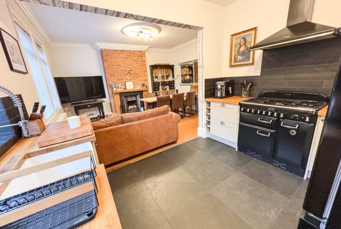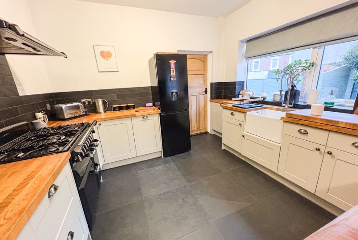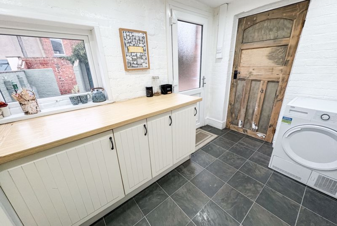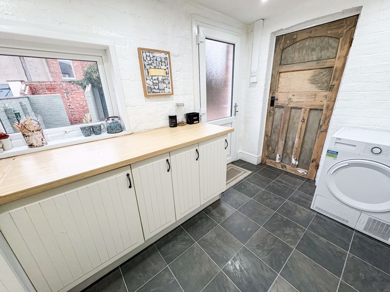 Double glazing to rear, radiator. Range of wall, floor and drawer units with work surfaces. Sink unit and drainer with mixer tap, tiled splash backs, space for cooker/range oven, tiled floor