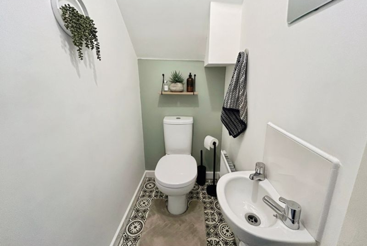 DOWNSTAIRS W.C.: Low level W.C, pedestal wash hand basin, radiator, extractor fan.