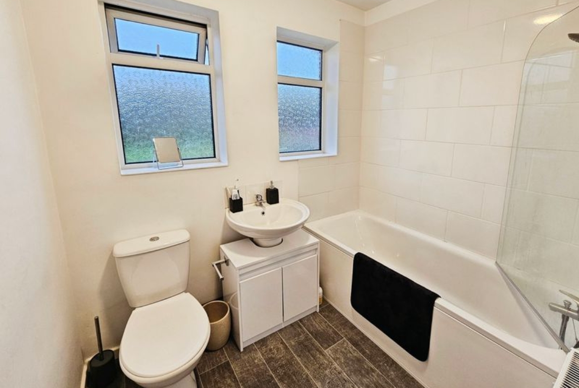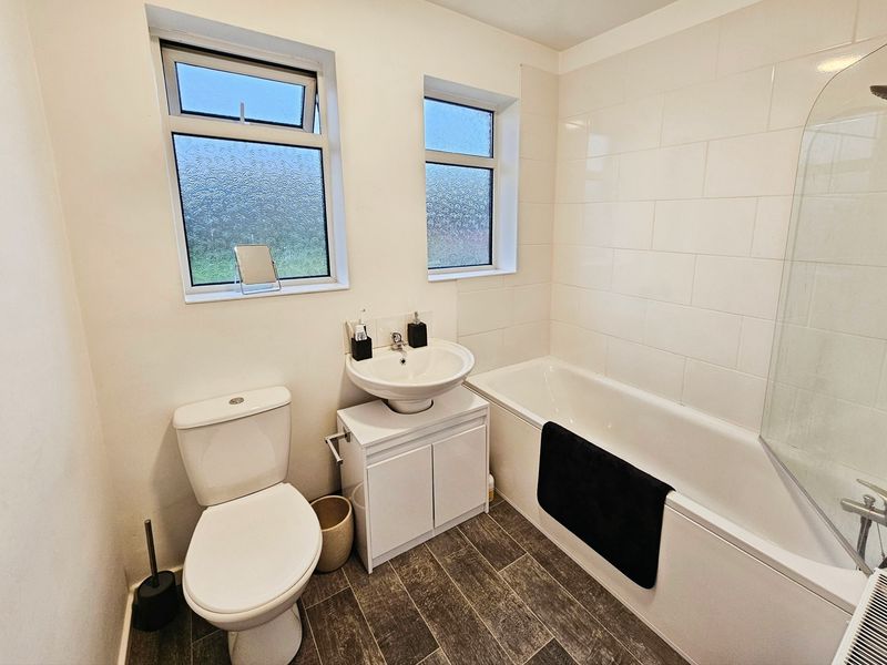Three piece white suite comprising of; paneled bath with mains shower over, pedestal wash hand basin, low level wc, two double glazed windows to rear, double radiator, part tiling to walls, laminate flooring.