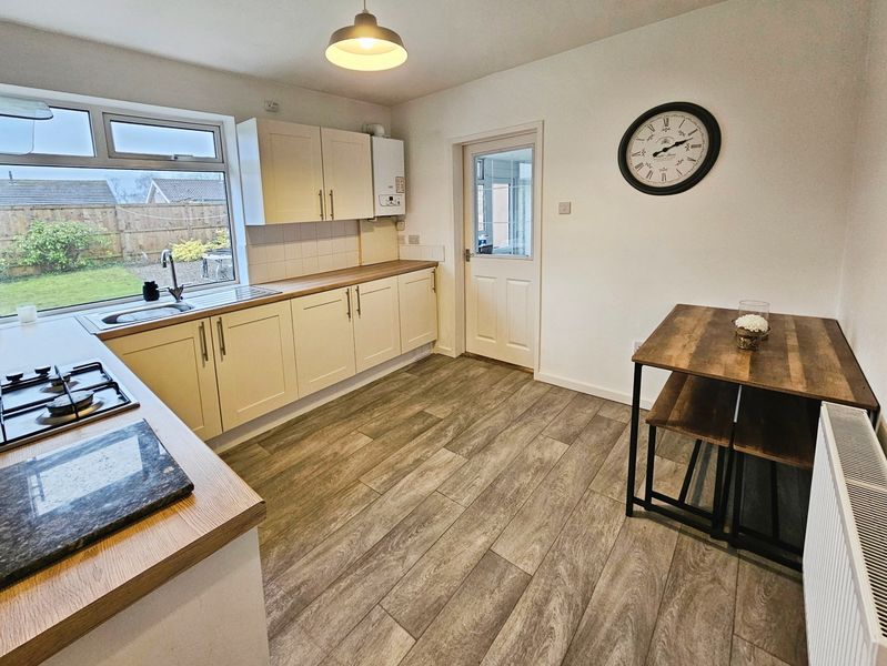 Double glazed window to rear, double radiator, fitted with a range of wall, floor and drawer units with coordinating roll edge work surfaces, stainless steel sink unit and drainer with mixer tap, tiled splash backs, built in electric fan assisted oven, gas hob with extractor fan above, laminate flooring.