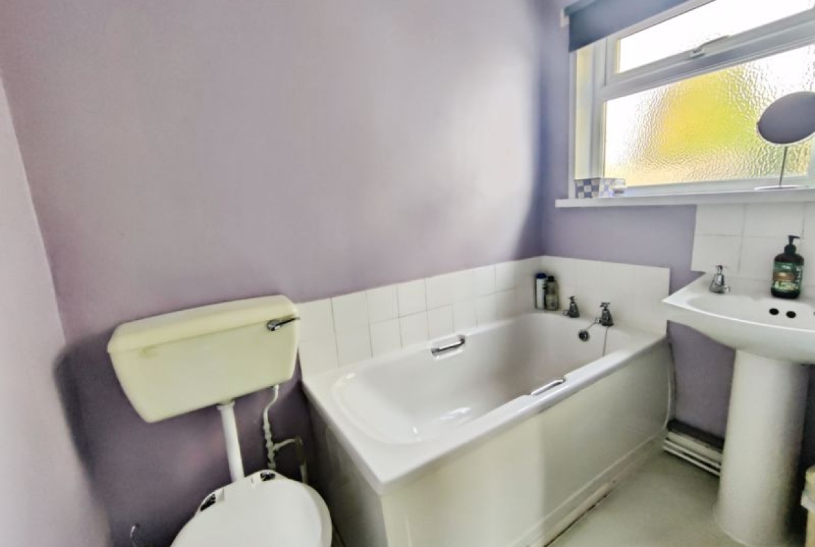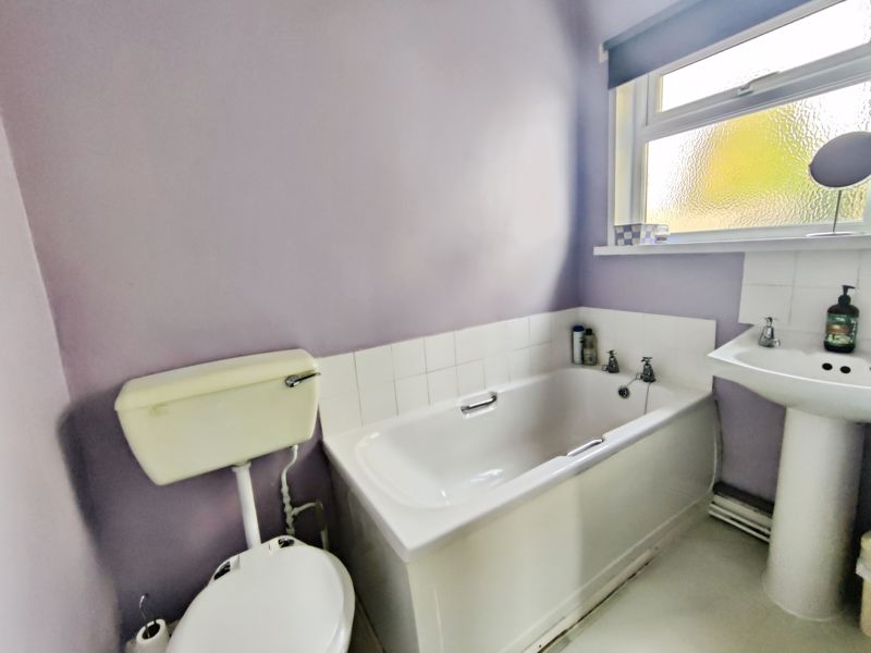 Three piece white suite comprising of; panelled bath, pedestal wash hand basin, low level wc, double glazed window to side, single radiator, part tiling to walls, tiled flooring, extractor fan.