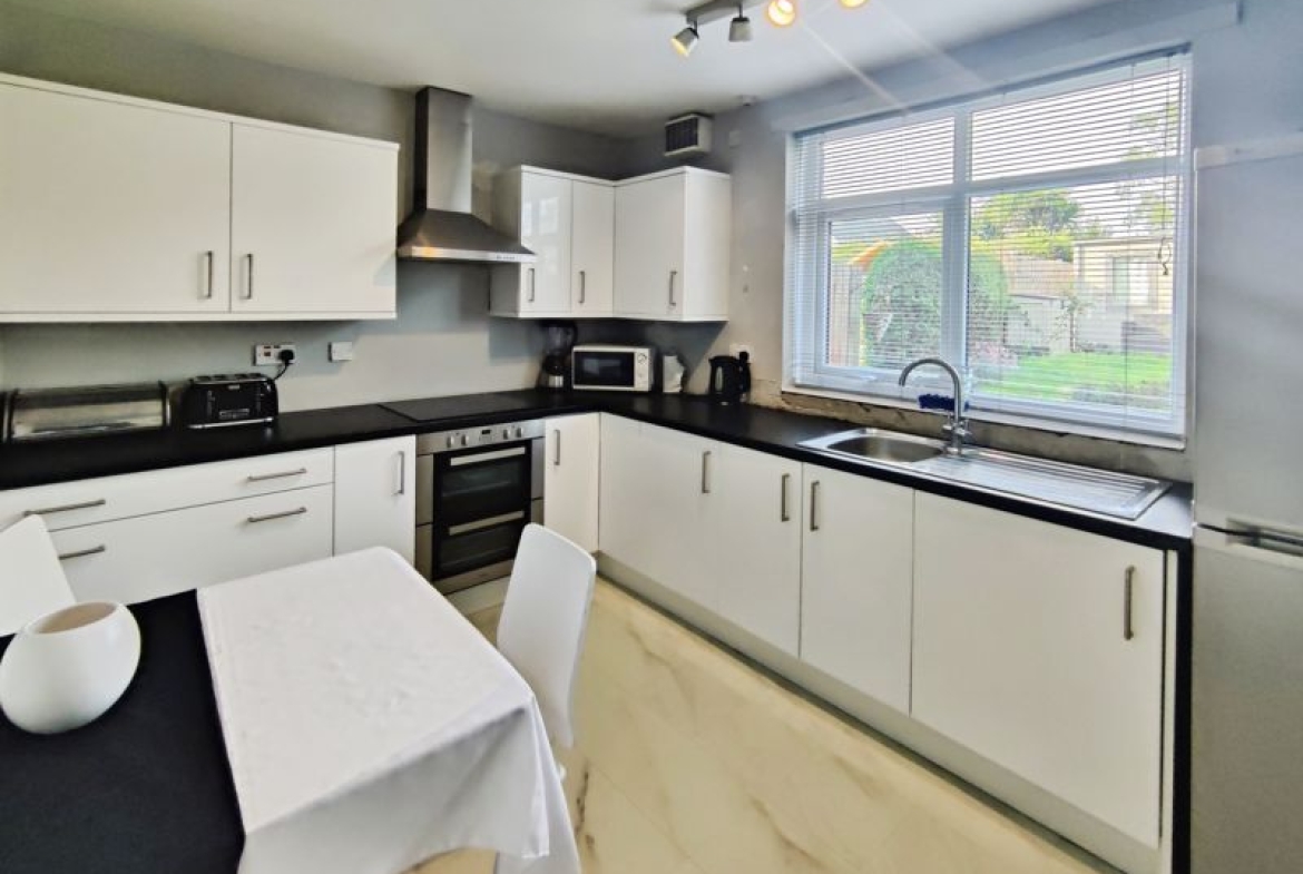 Double glazed window to rear, single radiator, fitted with a range wall, floor and drawer units with co-ordinating roll edge work surfaces, stainless steel sink unit and drainer with mixer tap, built in electric fan assisted double oven, electric hob with extractor fan above, space for cooker, integrated washing machine, tiling to floor.