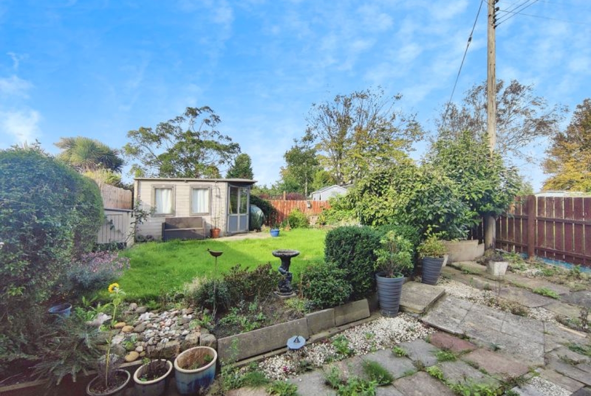 Rear garden laid mainly to lawn, flower beds, bushes and shrubs, summer house, garden shed.