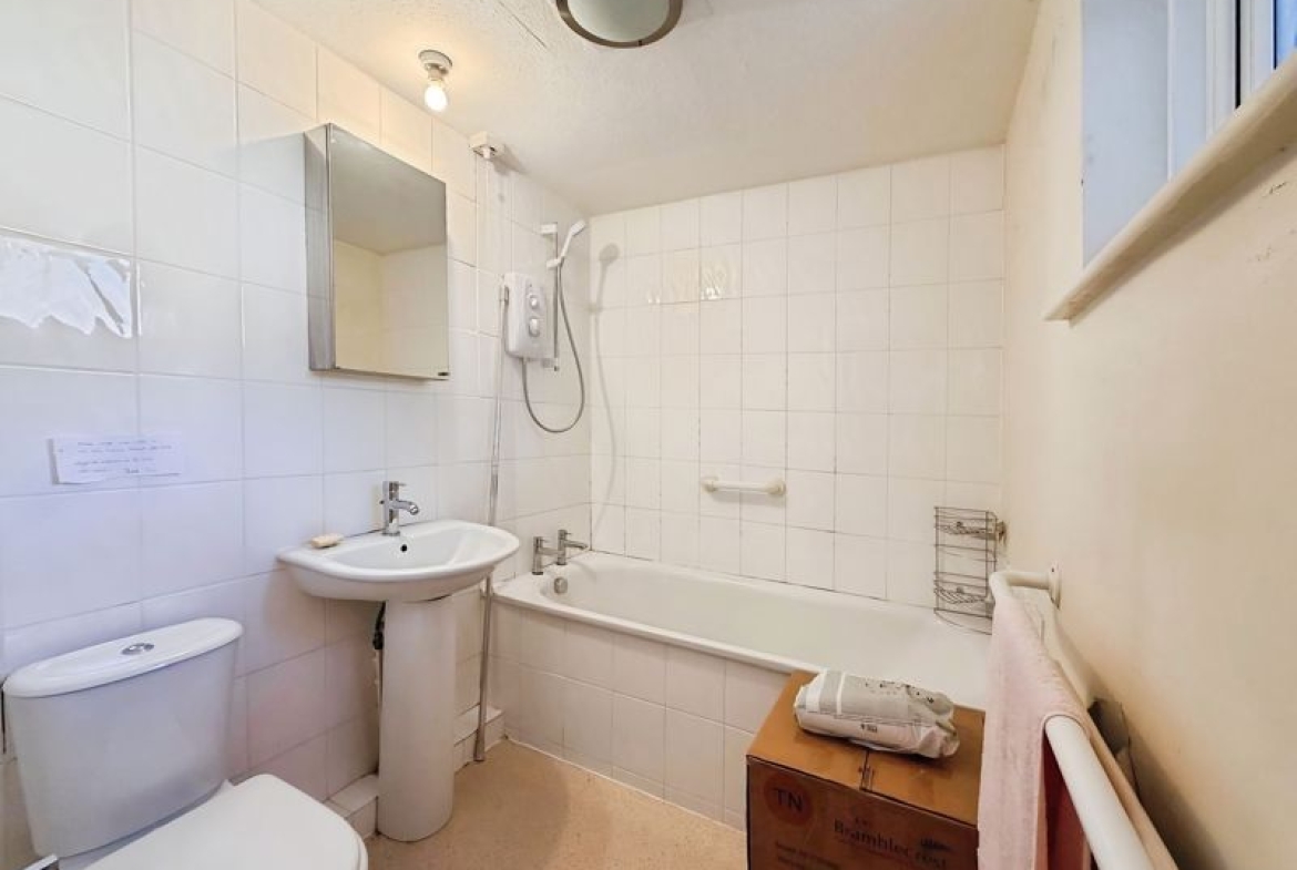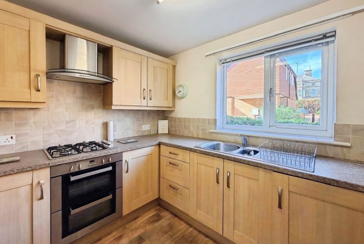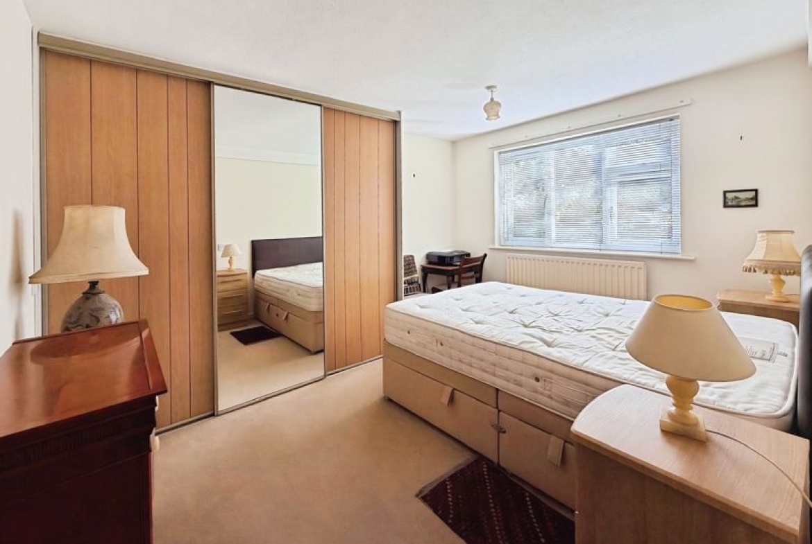 The well-appointed kitchen comes complete with integrated appliances, ensuring both functionality and a modern finish. The main bedroom features a spacious double size and benefits from fitted built-in wardrobes, providing ample storage.