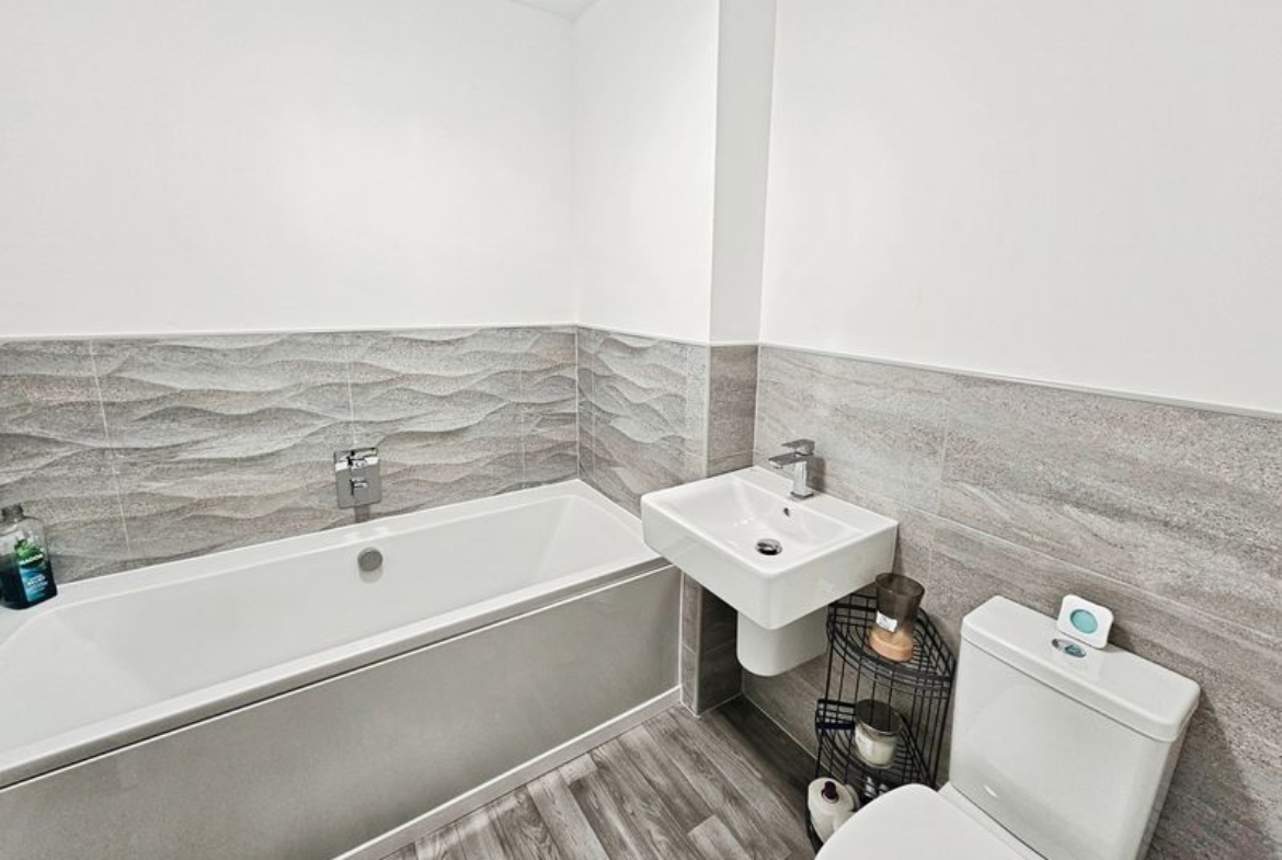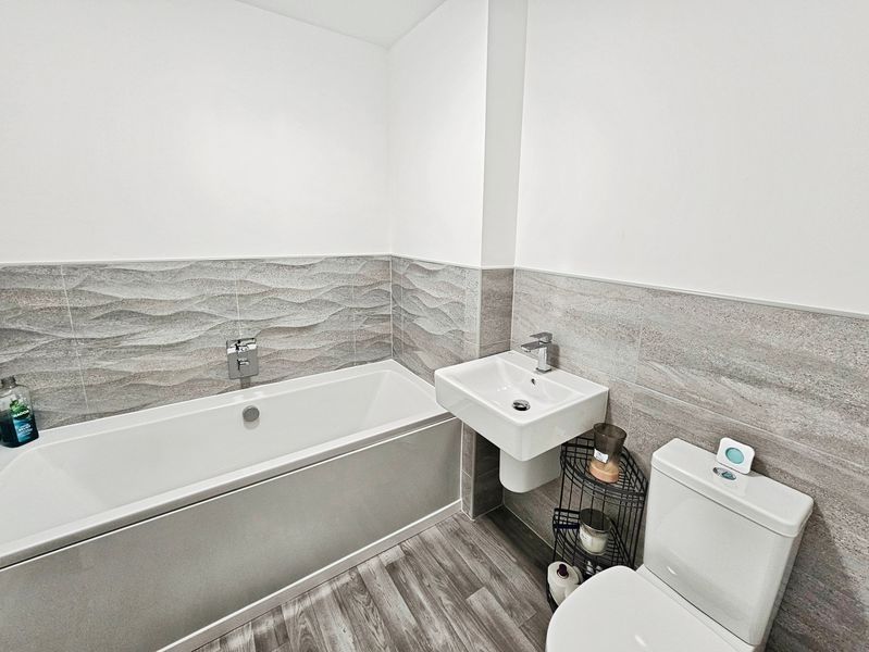 Three piece white suite comprising of; panelled bath, floating pedestal wash hand basin, low level wc, single radiator, extractor fan.