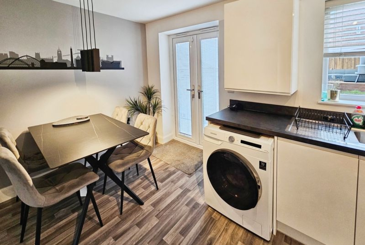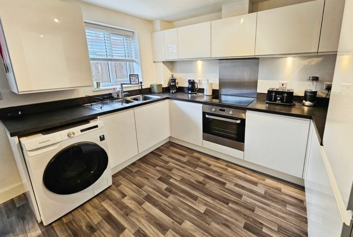Double glazed window to rear, double radiator, fitted with a range of wall, floor and drawer units with co-ordinating roll edge work surfaces, stainless steel sink unit and drainer with mixer tap, built in electric fan assisted oven, electric hob with extractor fan above, integrated fridge freezer and dishwasher, plumbed for washing machine, laminate flooring, spotlights, double glazed patio doors to rear.