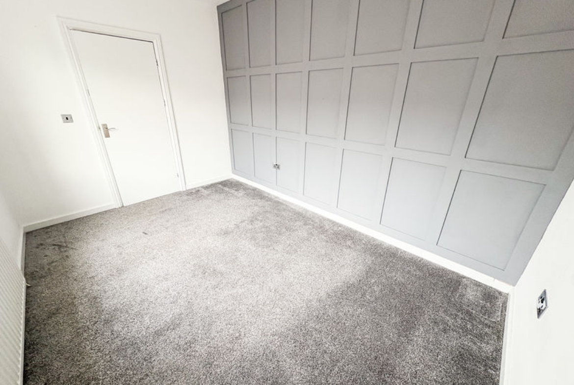 BEDROOM ONE: (side): 12’63 x 8’97, (3.84m x 2.73m), double glazed window to side, single radiator and panelled walls.