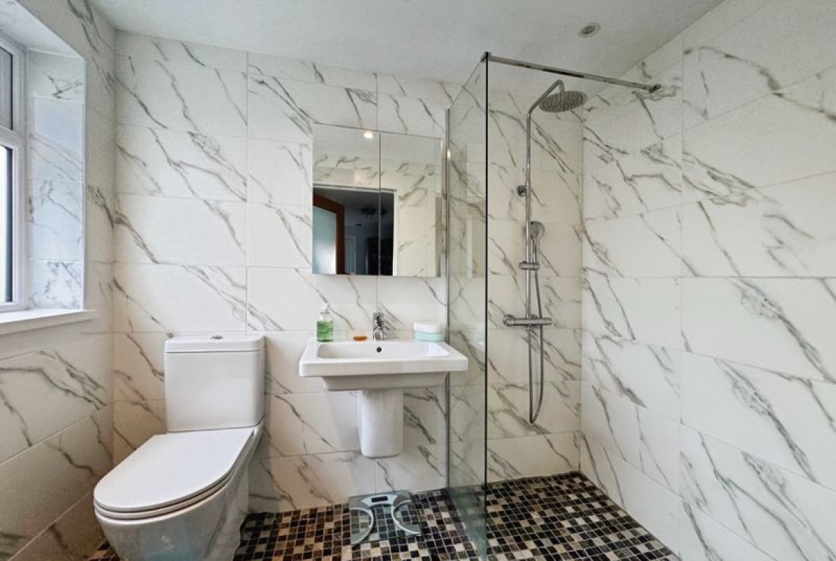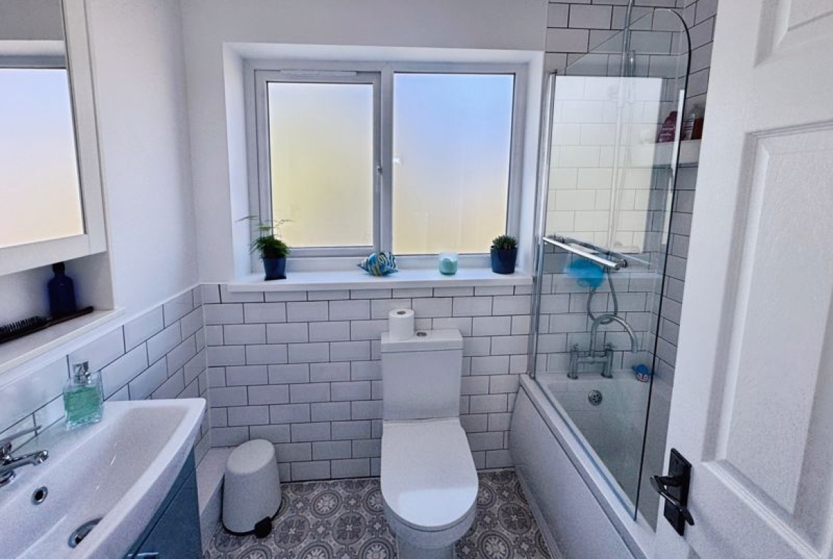 UPVC window, newly fitted bath with shower, low level wc, vanity wash hand basin and heated towel rail.