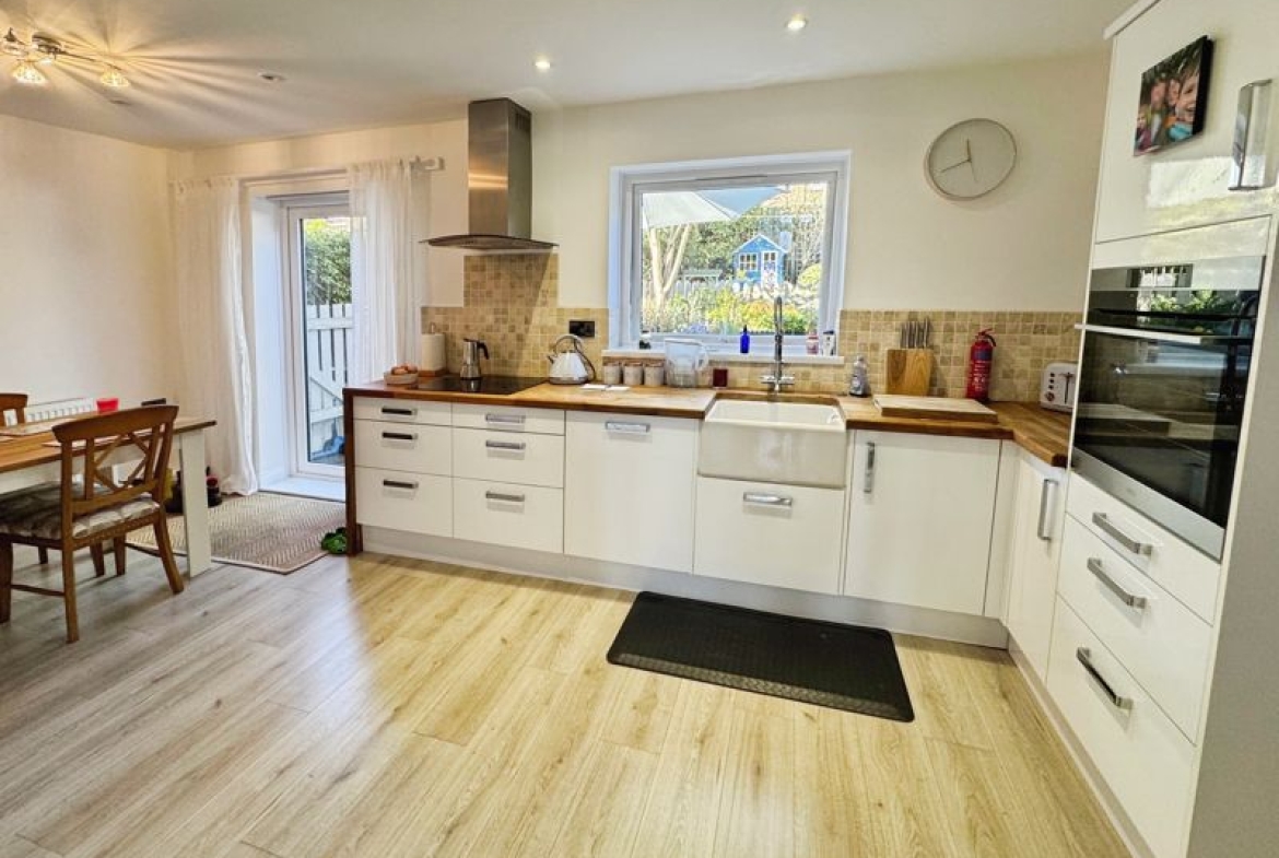 UPVC window, UPVC French doors, fitted with a range of matching wall and base units with wooden work surfaces above incorporating Belfast sink unit, induction hob, electric oven and radiator.