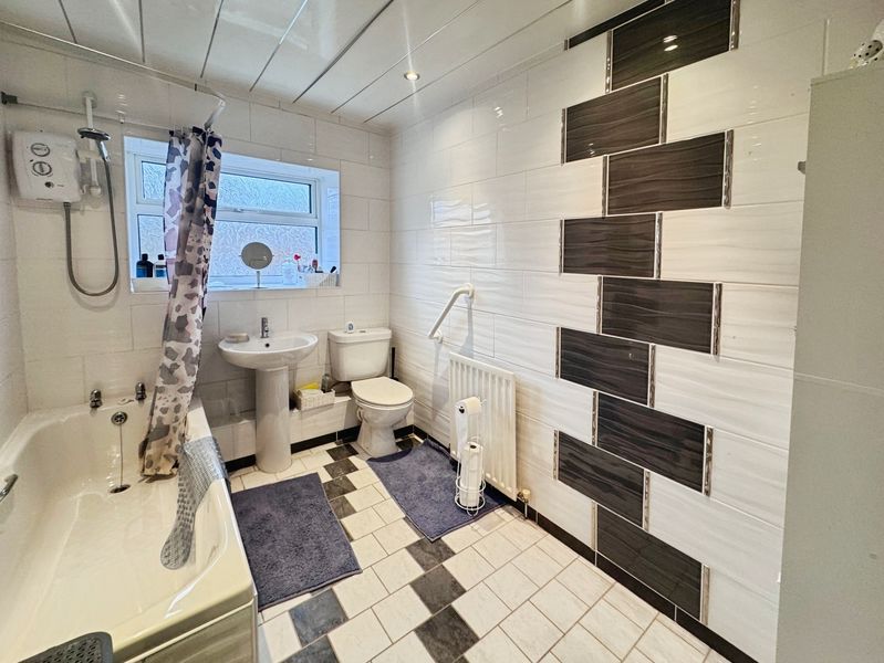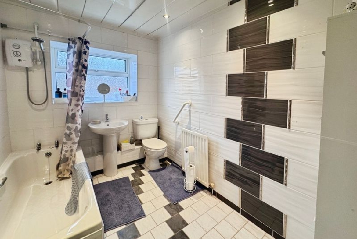UPVC window, bath, shower, low level wc, wash hand basin, fully tiled and radiator