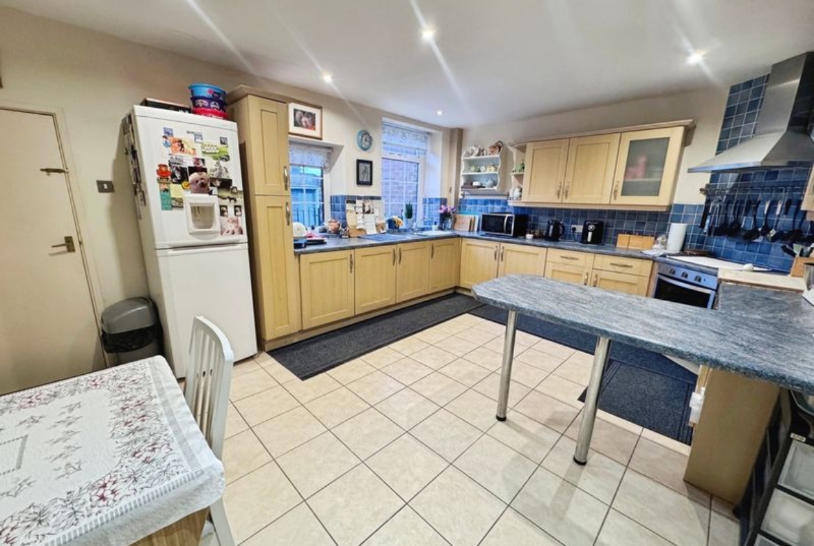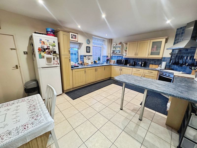 Two UPVC windows, fitted with a range of matching wall and base units with work surfaces above incorporating one and a half bowl sink unit with drainer, integrated electric oven and hob, integrated fridge freezer, Breakfast bar, dining space and radiator.