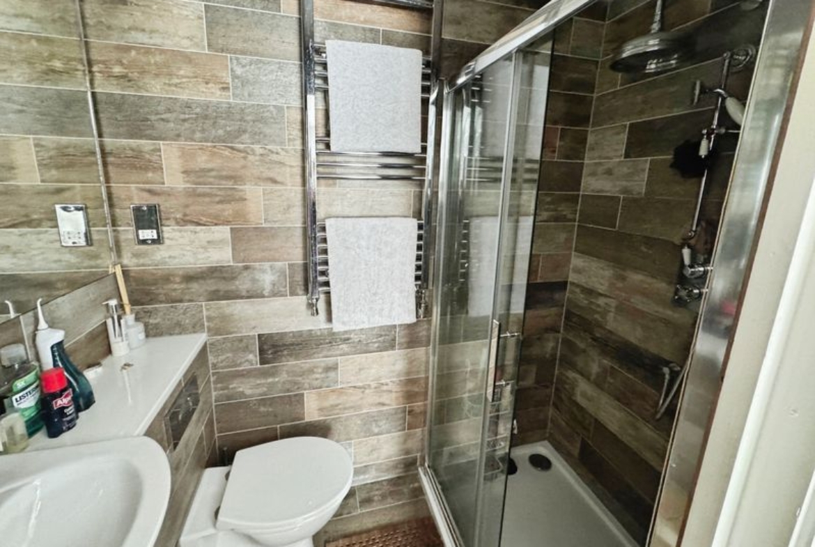 Shower, low level wc, wash hand basin, fully tiled and heated towel rail.