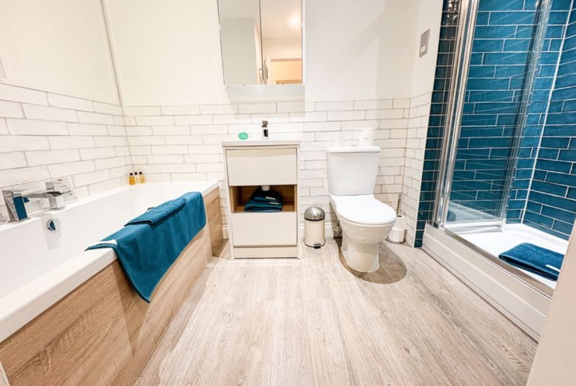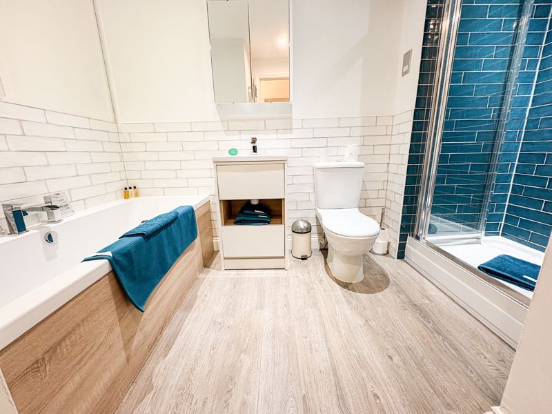 Double shower cubicle with mains shower, panelled bath, and low level w.c, pedestal wash hand basin, extractor fan, spotlights, radiator, tiled splash backs.