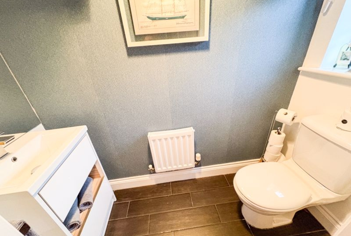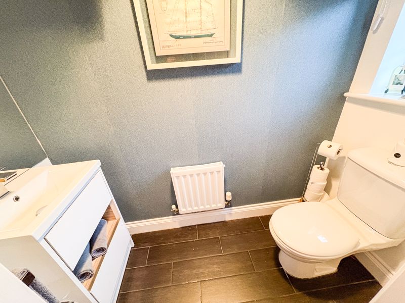Low level w.c, wash hand basin, tiled splash back radiator, double glazed window to front, tiled floor.