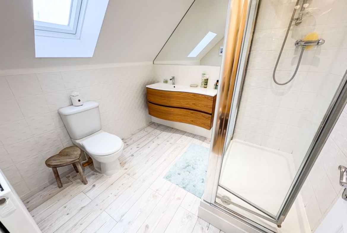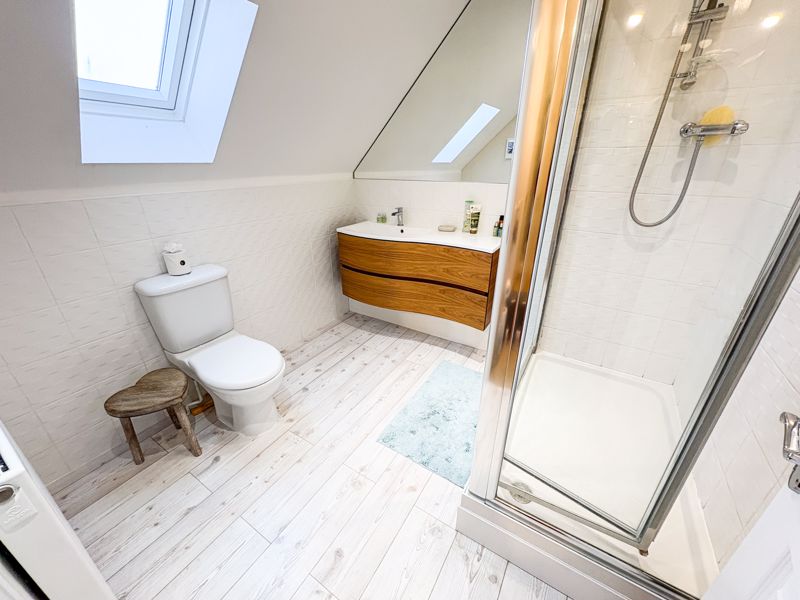 Double shower cubicle with mains shower, pedestal wash hand basin, low level W.C., part tiled walls, tiled floor, radiator, spotlights, extractor fan, and Velux sky window.