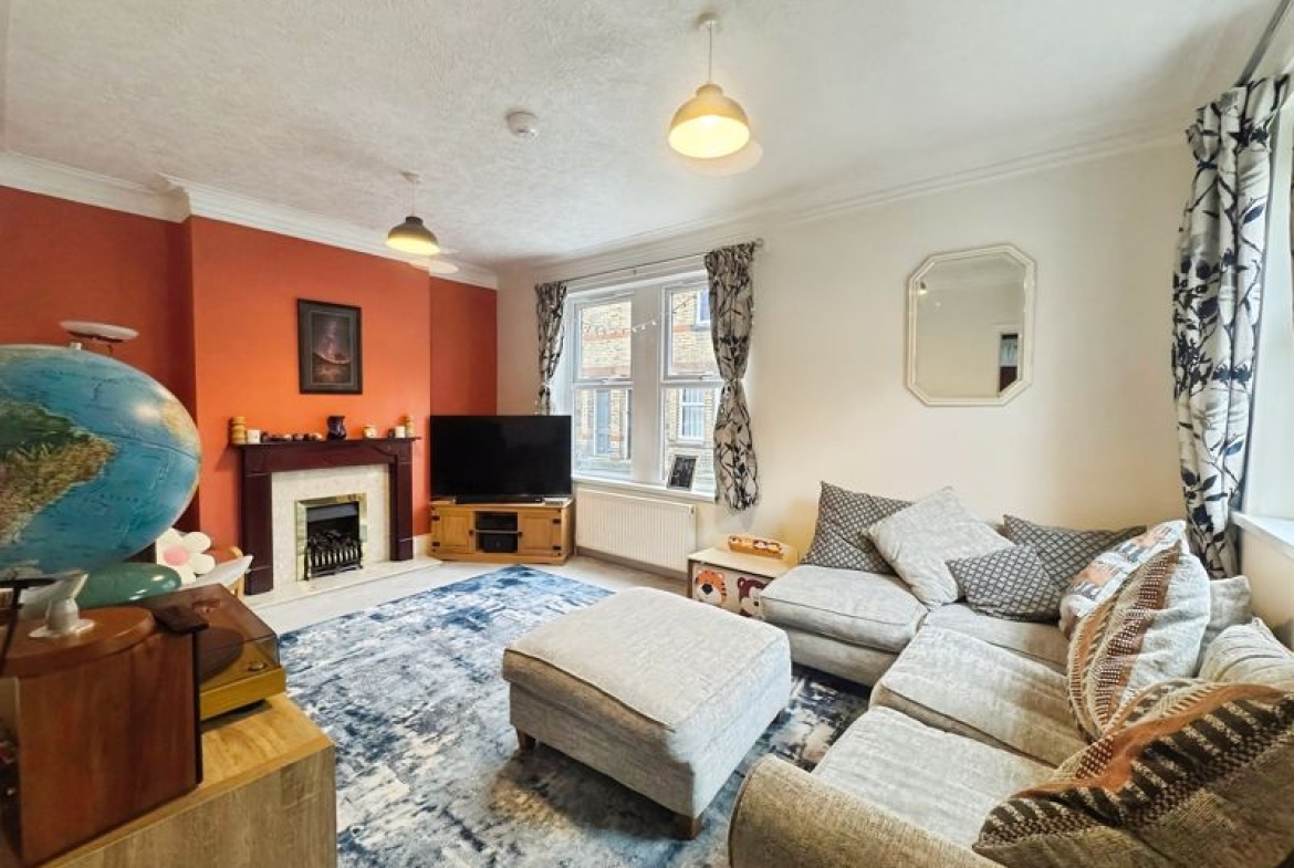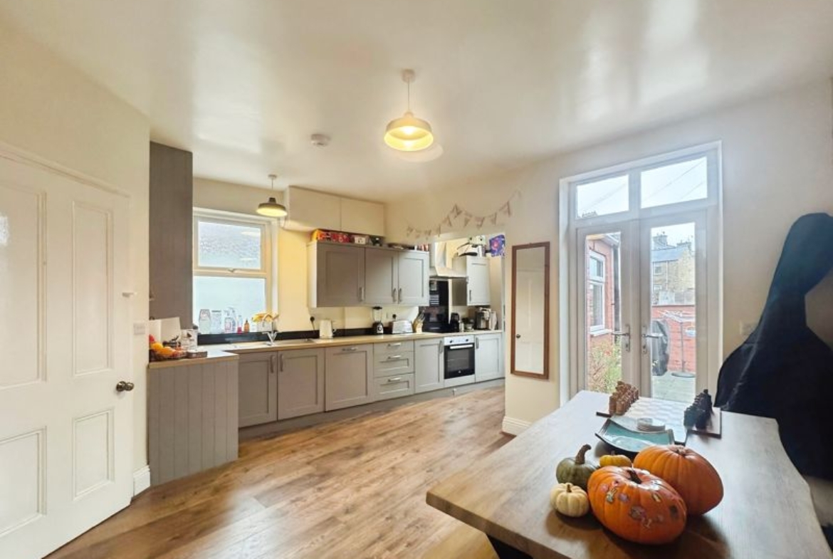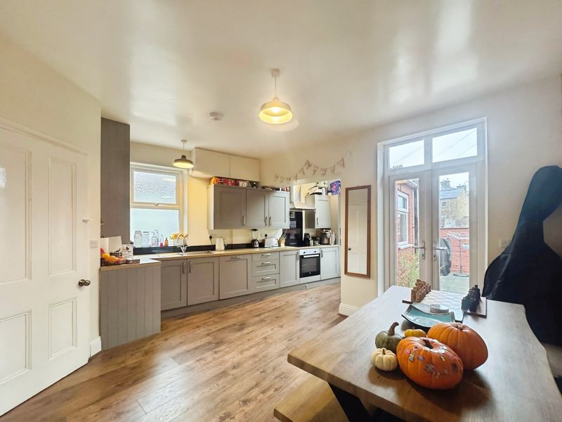 Seventeen feet long double aspect living room with feature carved timber period style fireplace with inset living flame coal effect gas fire, superb dining kitchen with twin French doors to rear, excellent range of ultra-modern base and eye level cabinets with built in oven, hob, extractor, fridge, freezer and dishwasher, complementing splash backs and laminate flooring.