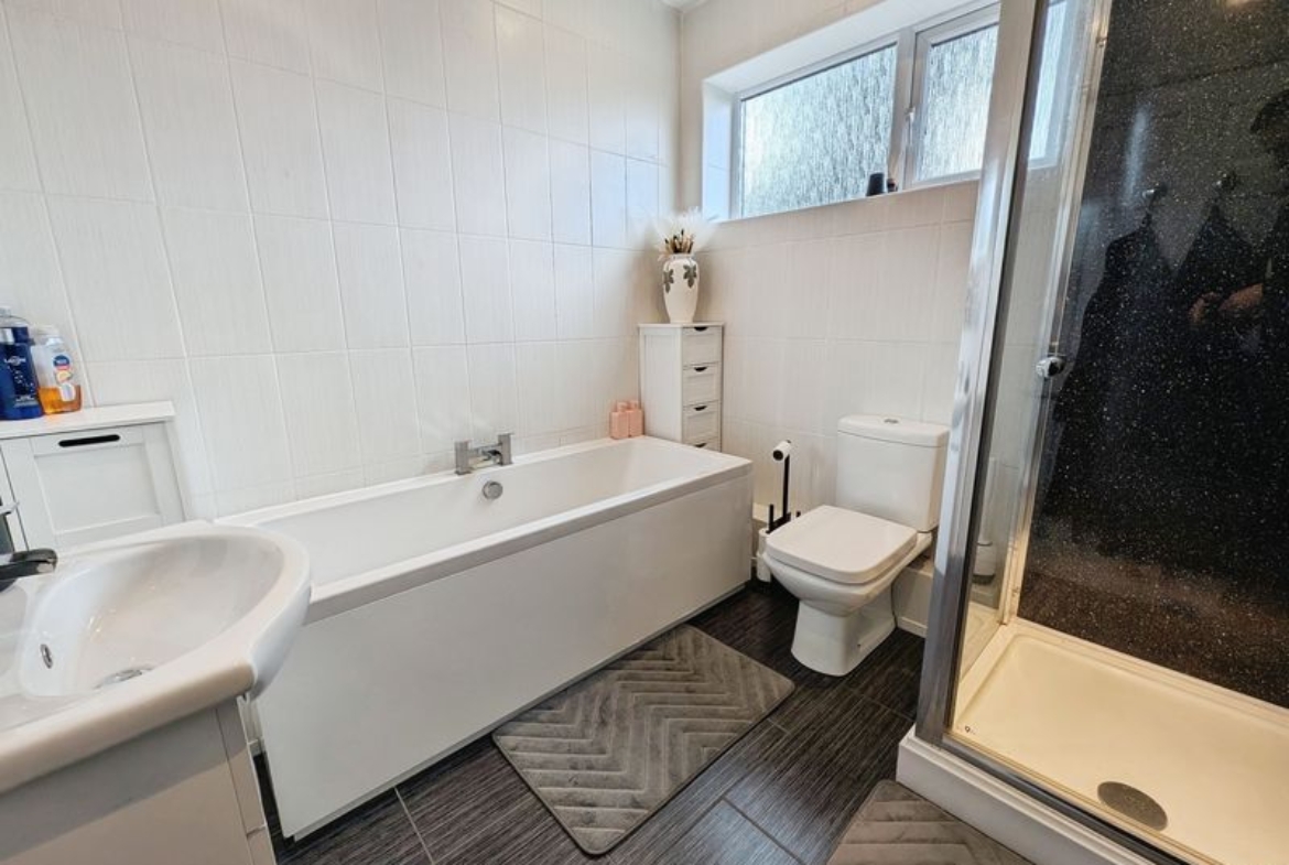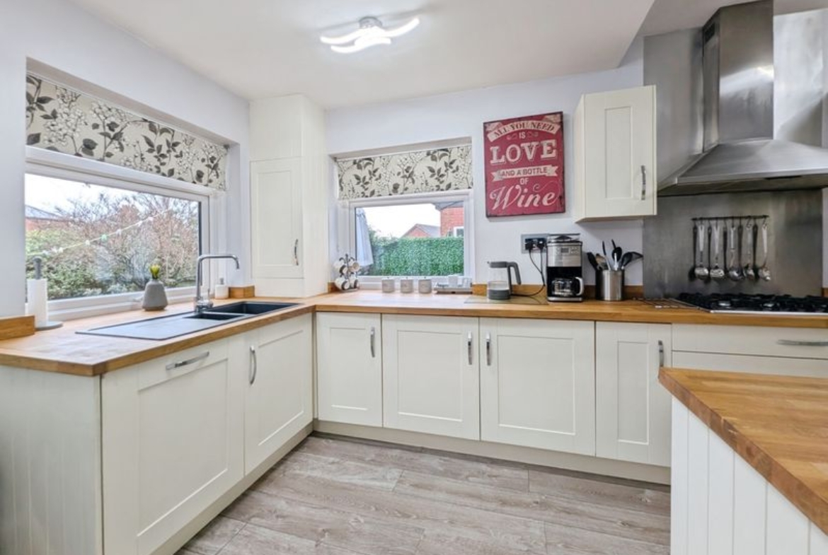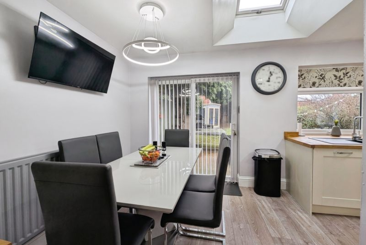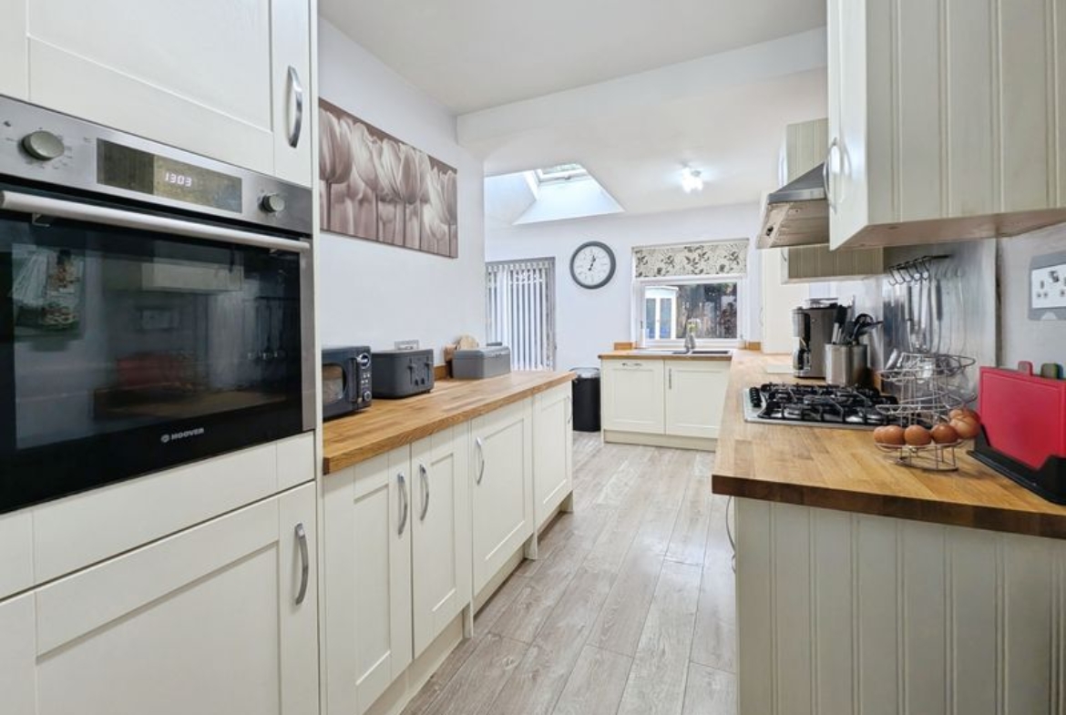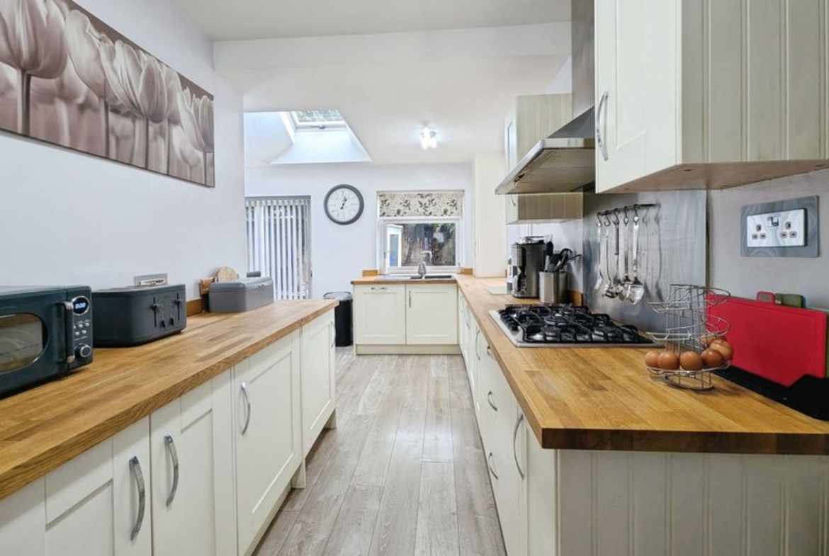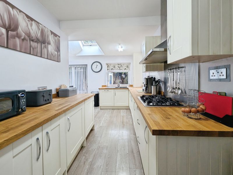 The ground floor includes a lounge which has open access to a second reception area, and a good sized kitchen with solid oak countertops, integrated dishwasher, integrated gas hob, separate built in oven and dining space, enhanced by a skylight and direct access to the garden. A ground floor WC adds practicality. Upstairs, the main bedroom benefits from an en suite, while the family bathroom features a panelled bath and separate shower cubicle. The property also has a further three bedrooms.