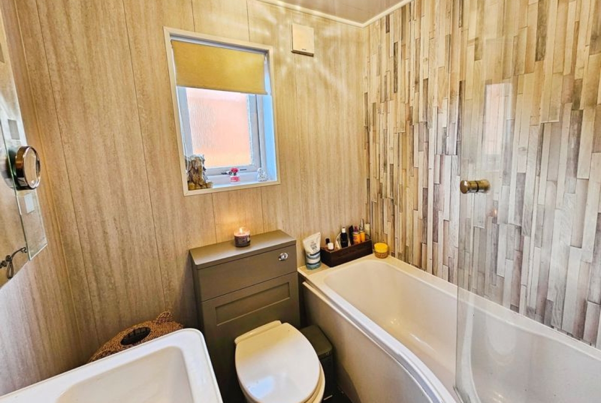 Three piece suite comprising of; panelled bath with mains shower over, wash hand basin (set in vanity unit), low level wc, double glazed window to side, heated towel rail, cladding to walls and ceiling, extractor fan.
