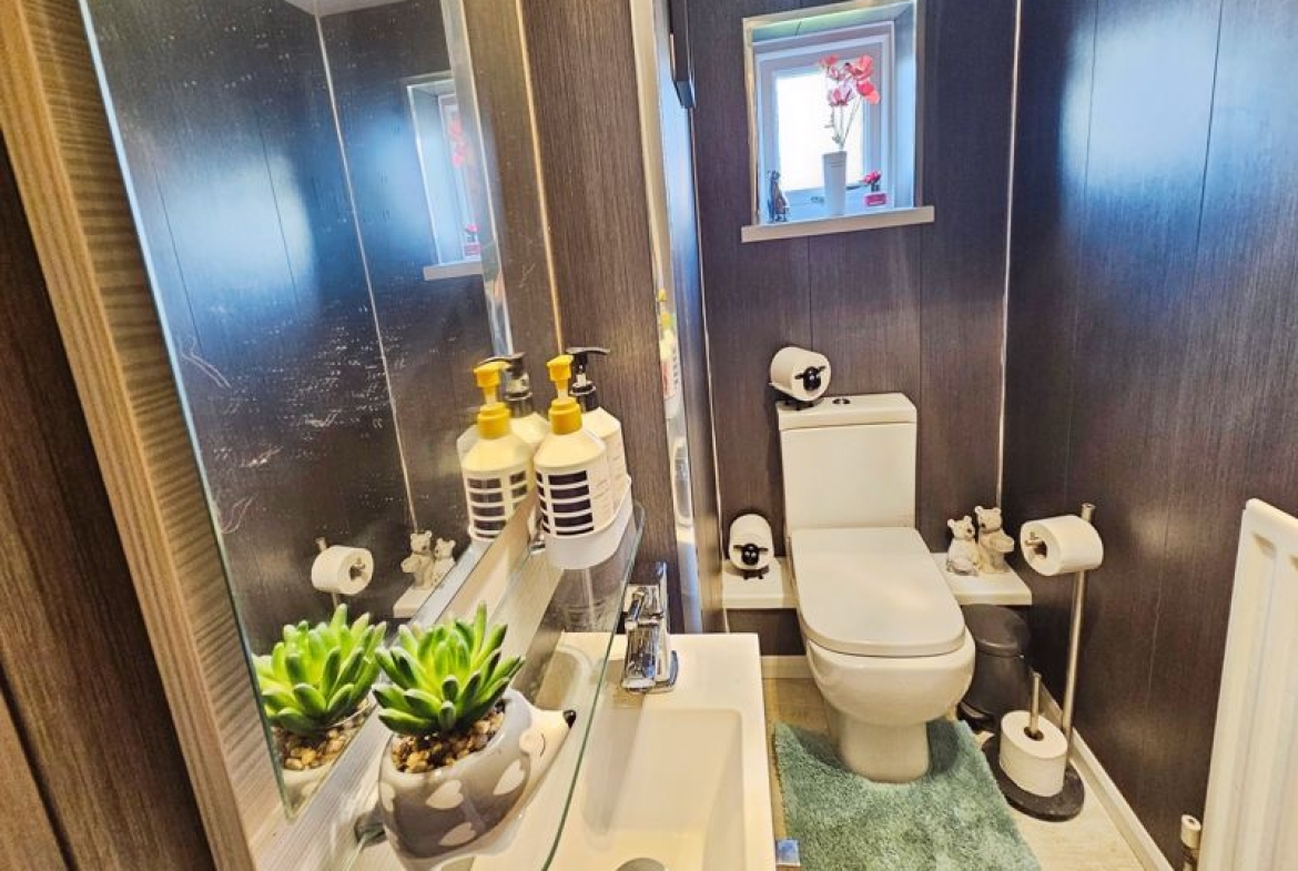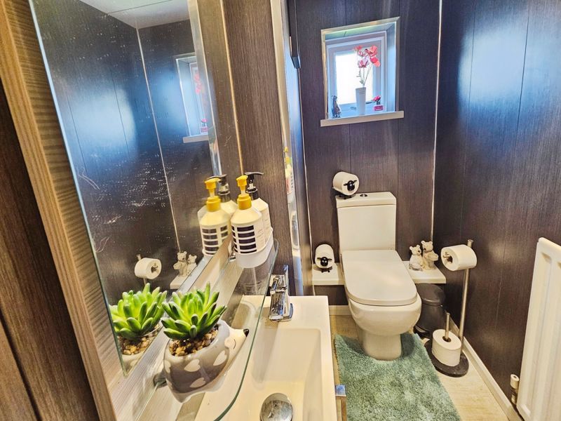 Low level wc, wash hand basin (set in vanity unit), laminate flooring, double glazed window, cladding to walls.