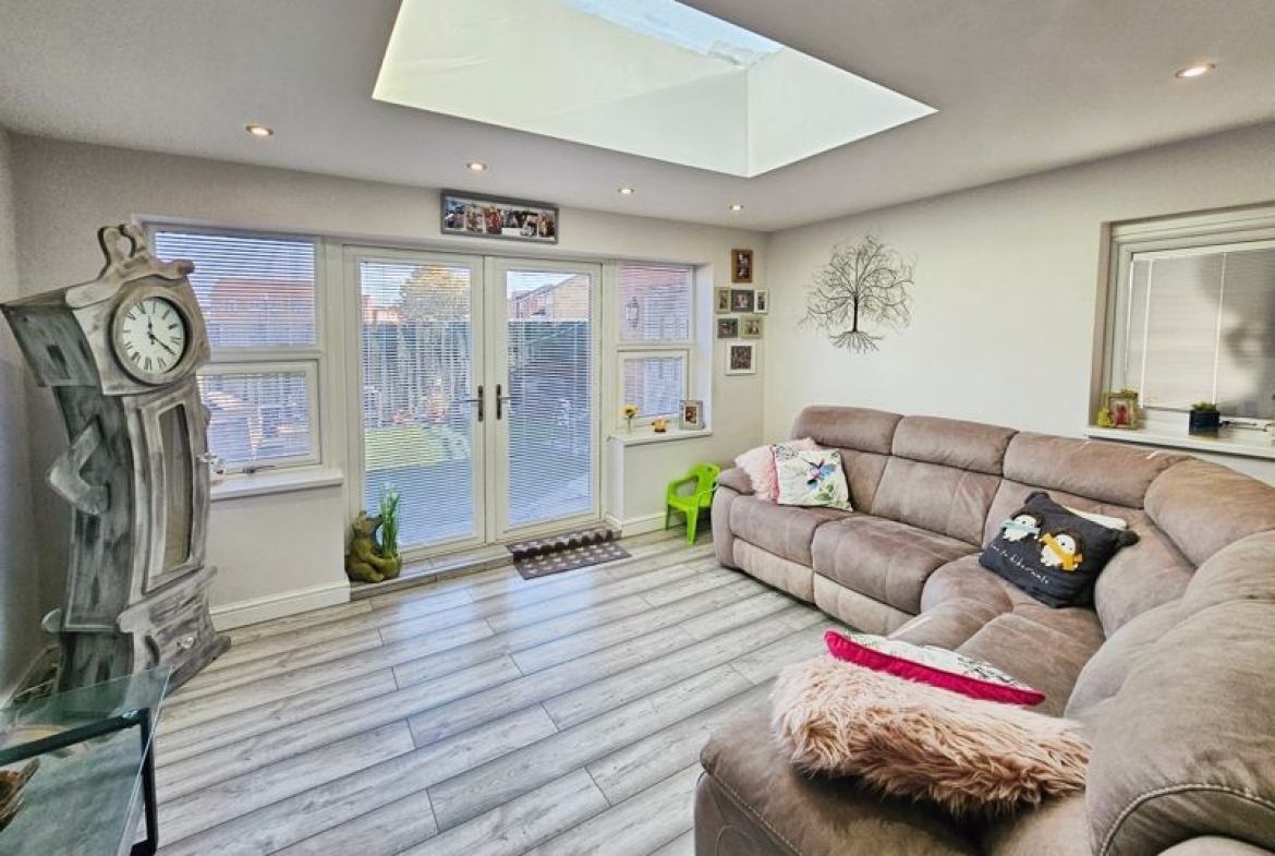 Double glazed window to side, fitted with a range of wall, floor and drawer units with co-ordinating roll edge work surfaces, co-ordinating sink unit and drainer with mixer tap, tiled splash backs, built in electric fan assisted oven, electric hob with extractor fan above, integrated fridge freezer, wine fridge, space for dishwasher, laminate flooring, spotlights, double glazed patio doors, skylights.