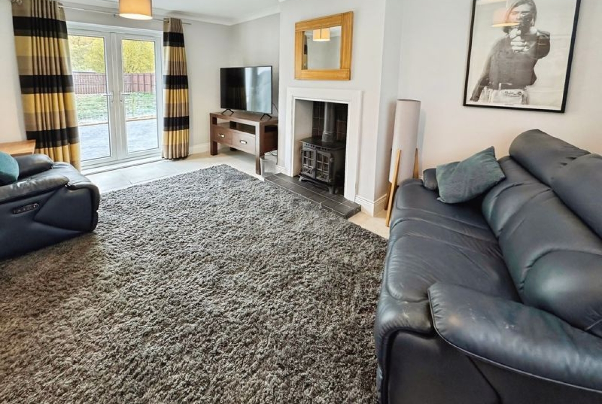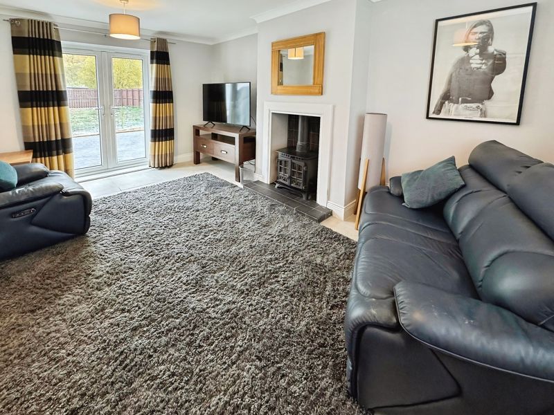The lounge boasts double internal doors from the hallway as well as double French doors to the rear patio area. A log burner set into the central fireplace is another lovely feature.