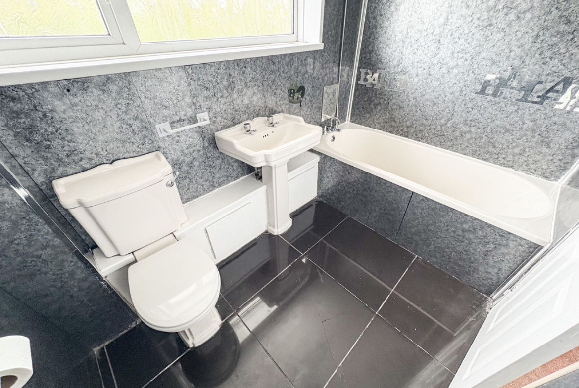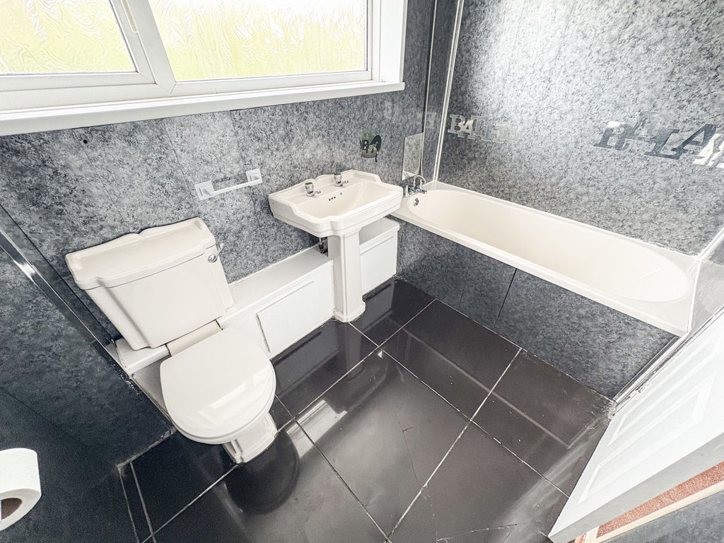 FAMILY BATHROOM: 3 piece suite comprising panelled bath, wash hand basin, low level wc, double glazed window to rear, double radiator tiled floor and cladding to walls.
