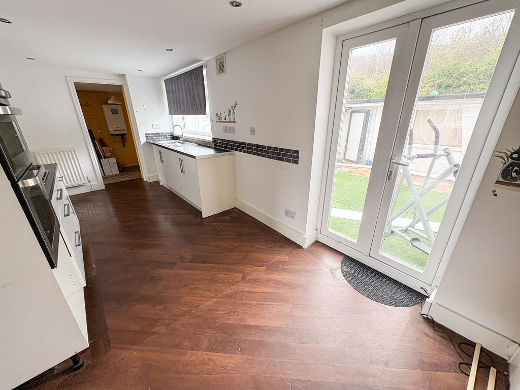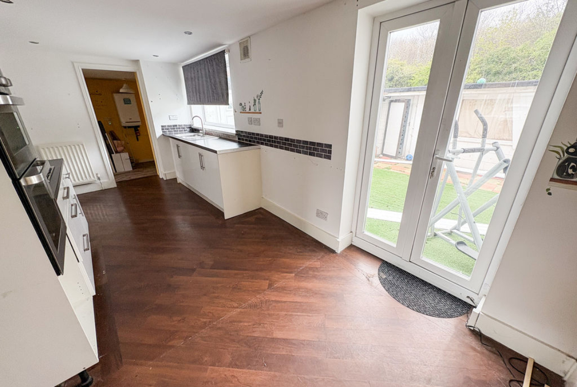 KITCHEN: (rear): 17’76 x 8’36, (5.41m x 2.54m), double glazed window to rear, double radiator, range of wall, floor and drawer units with coordinating roll edge work surfaces, oven, gas hob, space from fridge freezer, spotlight and patio doors to rear.