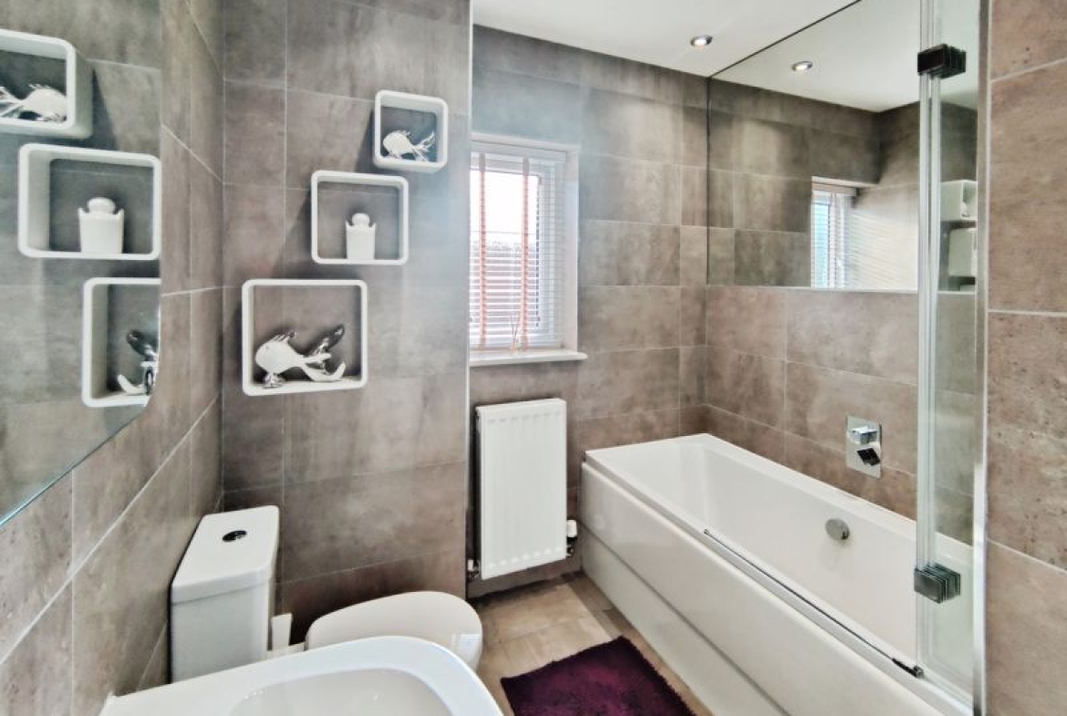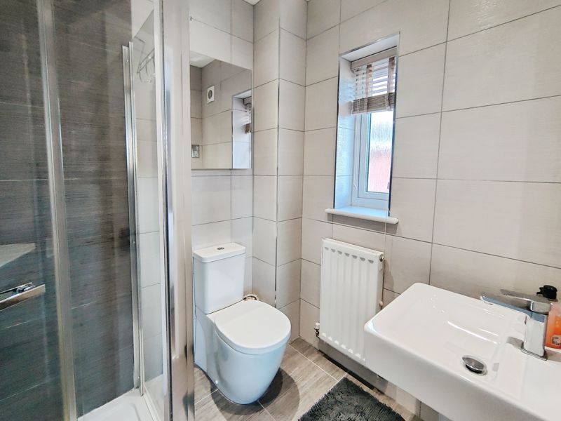 basin, mains shower cubicle, double radiator, extractor fan, tiling to