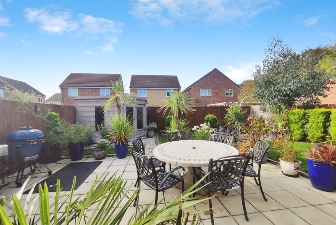 Patio area, decking, flower beds, bushes and shrubs, summer