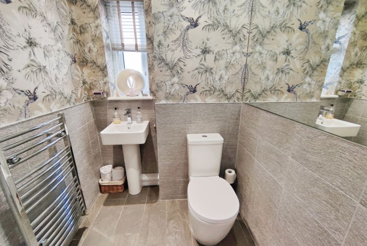 Low level WC, pedestal wash hand basin, tiling to floor, double glazed
