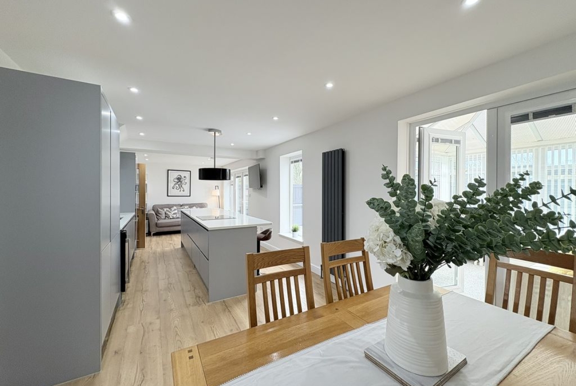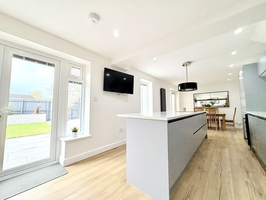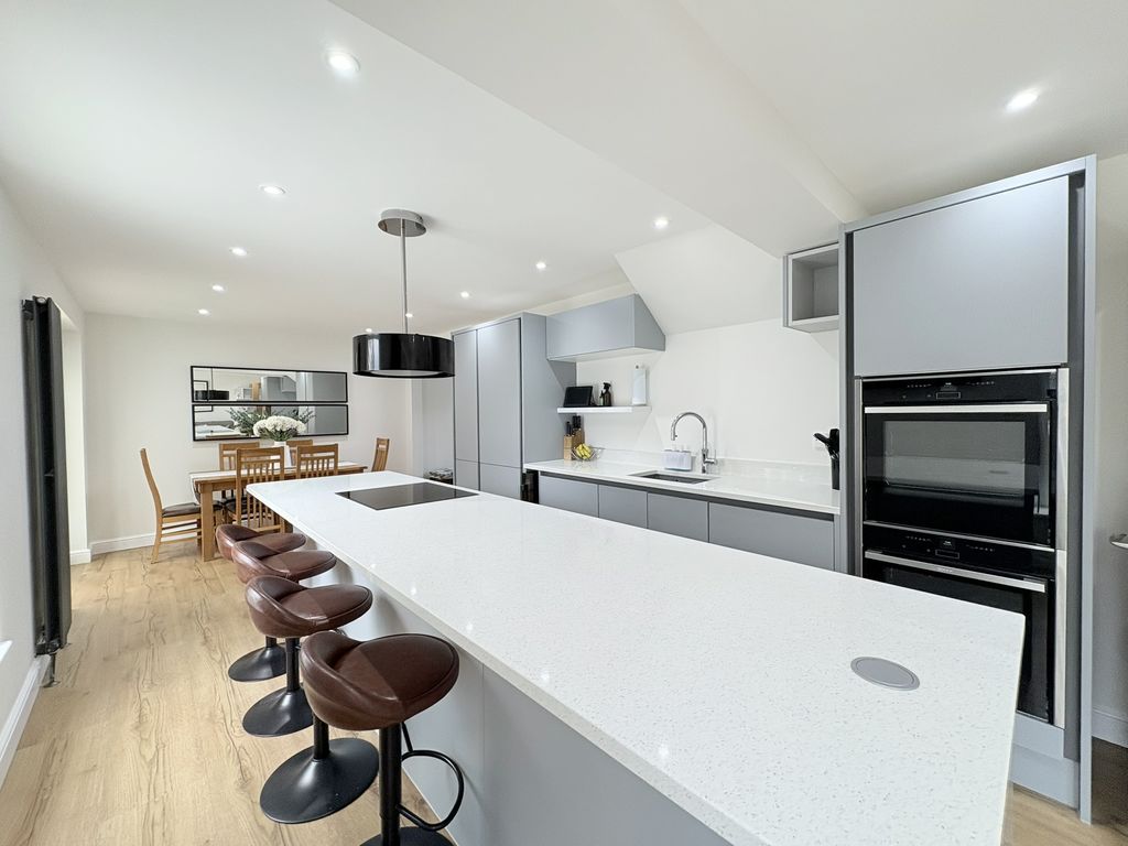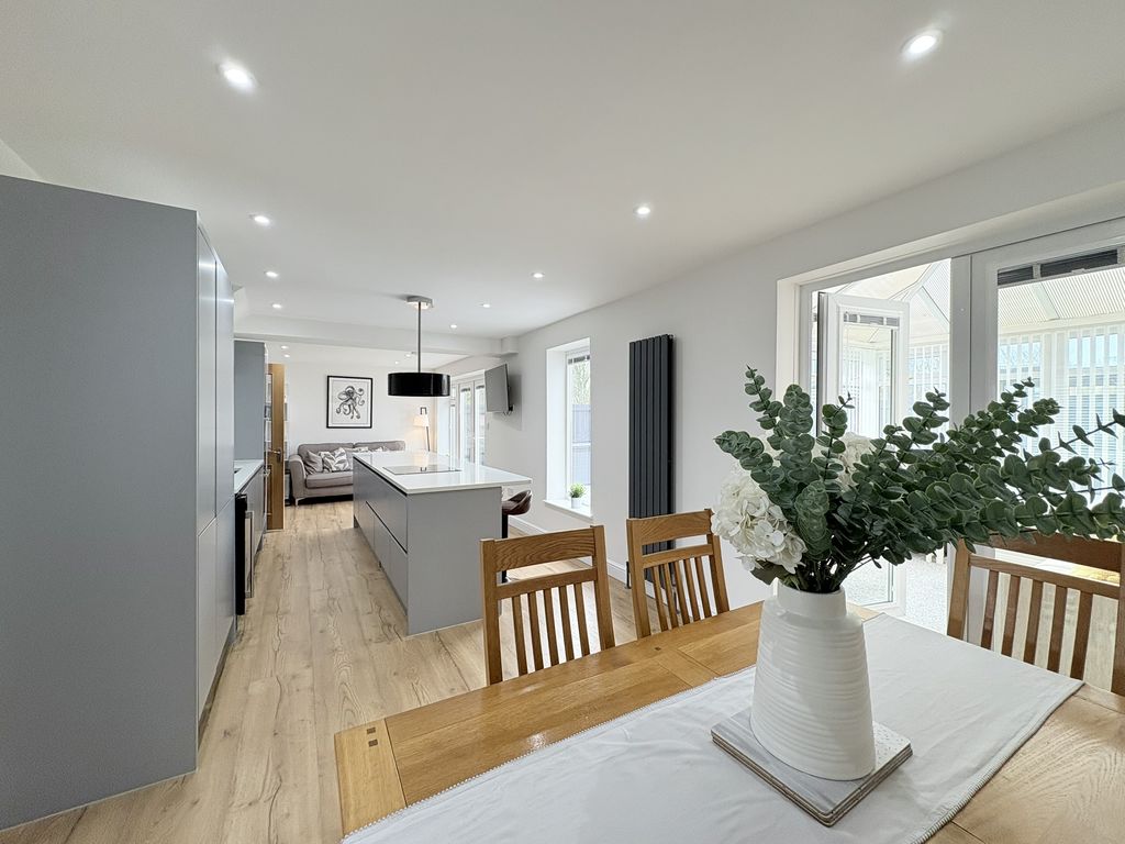 Defined by its impressive sense of space and seamless layout, this beautiful four-bedroom semi-detached home offers a striking open-plan centrepiece and a thoughtfully landscaped garden designed for both relaxation and entertaining. Step inside and the flow of the ground floor immediately stands out. The kitchen forms the heart of the home, centred around a substantial island that naturally anchors the space. With sleek cabinetry, integrated appliances and generous work surfaces creating a polished yet highly practical setting. French doors open directly onto the rear garden, allowing light to travel through the space and strengthening the connection between indoors and out. To the front, a separate lounge provides a more intimate retreat, while the conservatory offers a bright, garden-facing second reception, ideal as a sitting room, home office or additional entertaining space. A utility room, ground floor WC and garage area ensure everyday convenience is well catered for. Upstairs, four well-proportioned bedrooms provide flexible accommodation. The extended bedroom is particularly generous and benefits from a stylish en-suite shower room, while a contemporary family bathroom serves the remaining rooms. Outside, the landscaped rear garden has been designed with clear zones for outdoor living, from the porcelain patio to the pergola seating area and raised lawn.