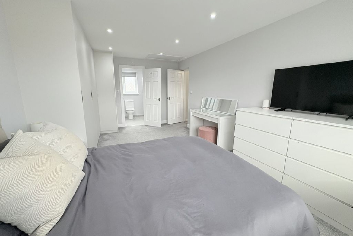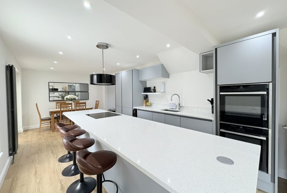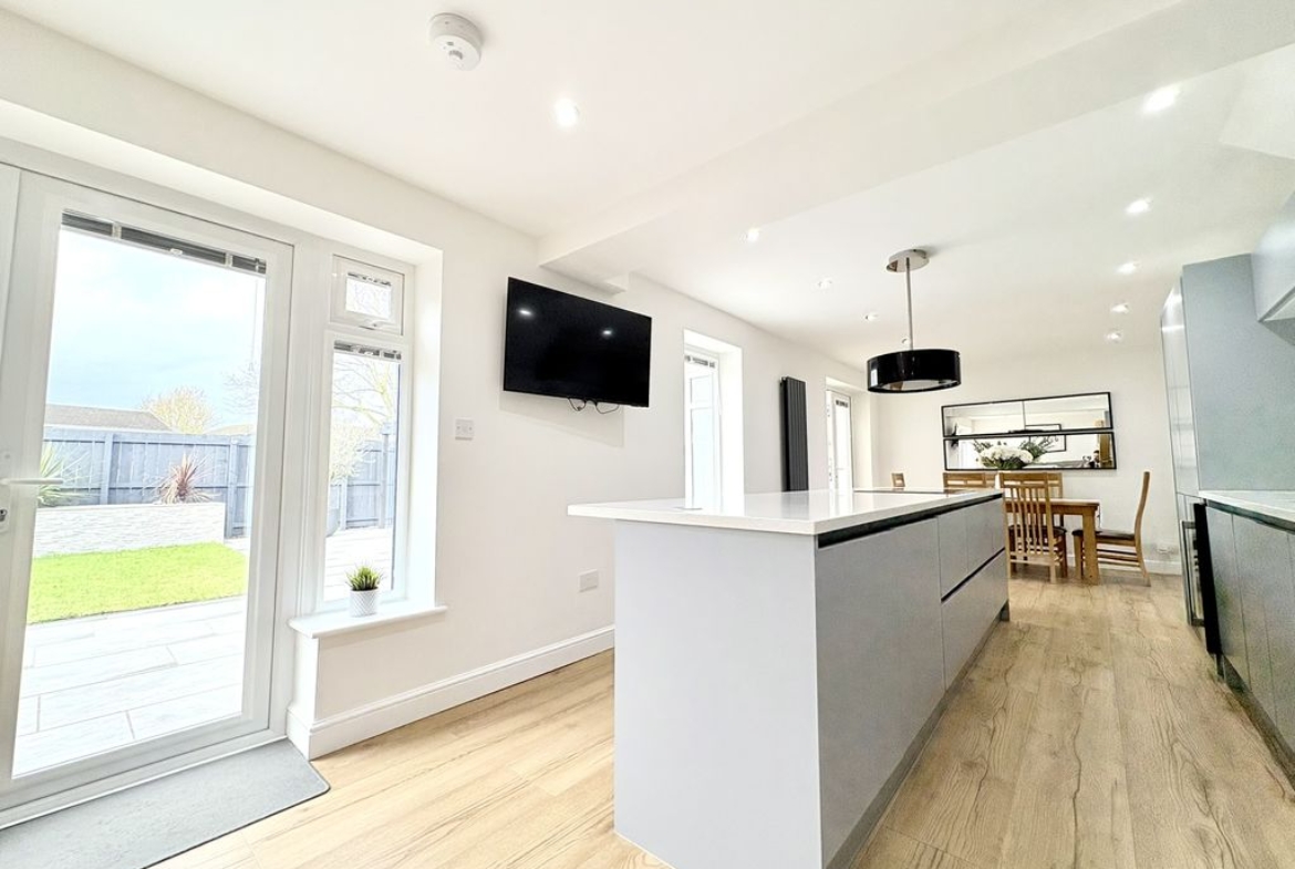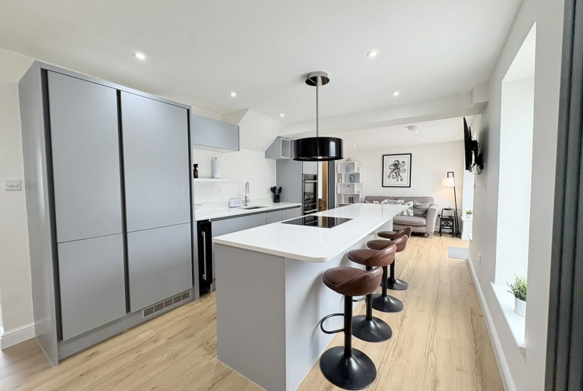 Defined by its impressive sense of space and seamless layout, this beautiful four-bedroom semi-detached home offers a striking open-plan centrepiece and a thoughtfully landscaped garden designed for both relaxation and entertaining. Step inside and the flow of the ground floor immediately stands out. The kitchen forms the heart of the home, centred around a substantial island that naturally anchors the space. With sleek cabinetry, integrated appliances and generous work surfaces creating a polished yet highly practical setting. French doors open directly onto the rear garden, allowing light to travel through the space and strengthening the connection between indoors and out. To the front, a separate lounge provides a more intimate retreat, while the conservatory offers a bright, garden-facing second reception, ideal as a sitting room, home office or additional entertaining space. A utility room, ground floor WC and garage area ensure everyday convenience is well catered for. Upstairs, four well-proportioned bedrooms provide flexible accommodation. The extended bedroom is particularly generous and benefits from a stylish en-suite shower room, while a contemporary family bathroom serves the remaining rooms. Outside, the landscaped rear garden has been designed with clear zones for outdoor living, from the porcelain patio to the pergola seating area and raised lawn.