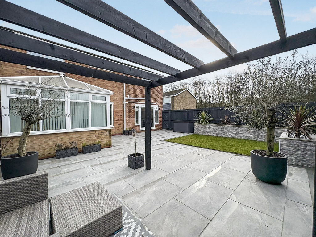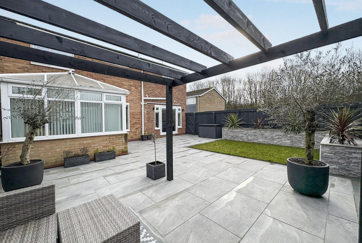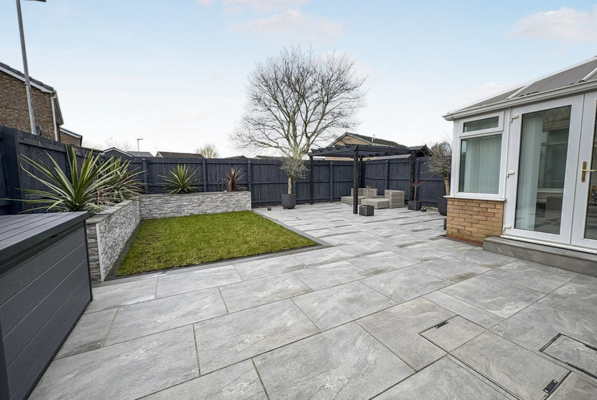 • Garden with Porcelain Patio, Raised Lawn & Pergola Seating